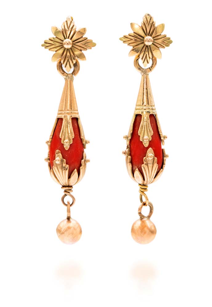 Coppia pendenti in oro e corallo Oro giallo 750/000. Peso complessivo gr. 11,70.
