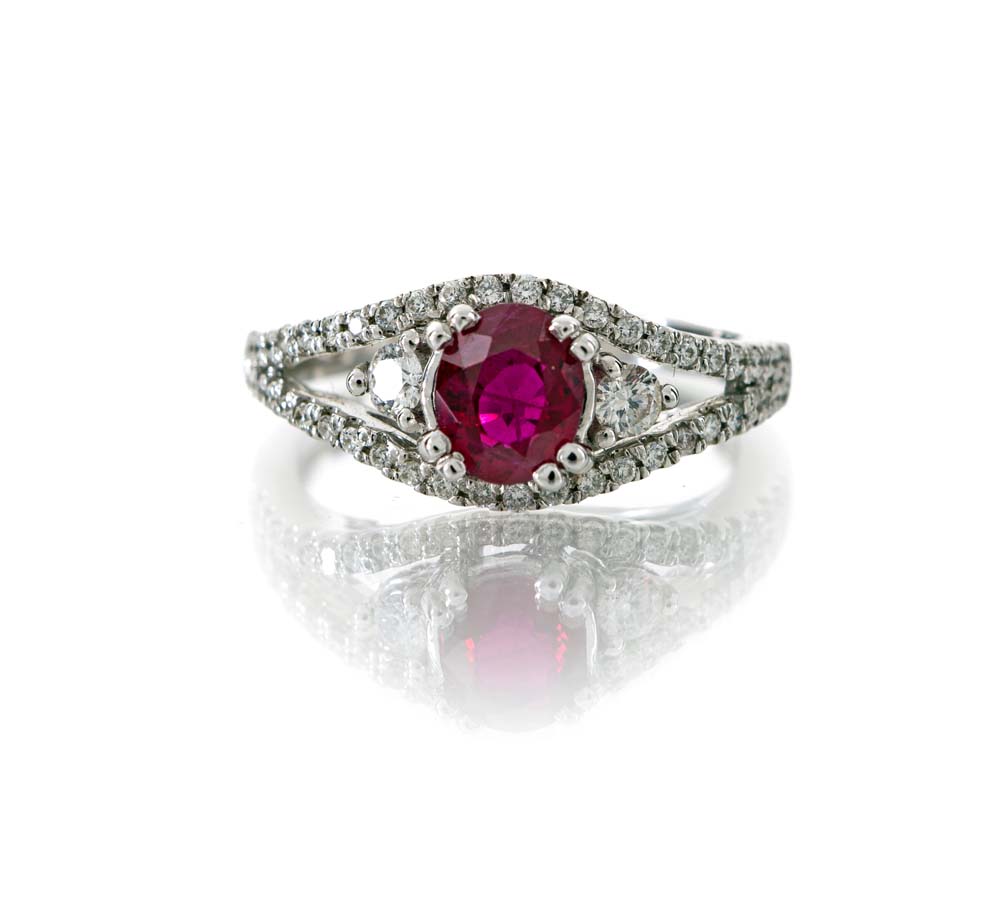 Anello in oro, rubino e brillanti Oro bianco 750/000. Rubino in taglio ovale ct. 1,10. Peso complessivo gr. 5,10 Misura 13