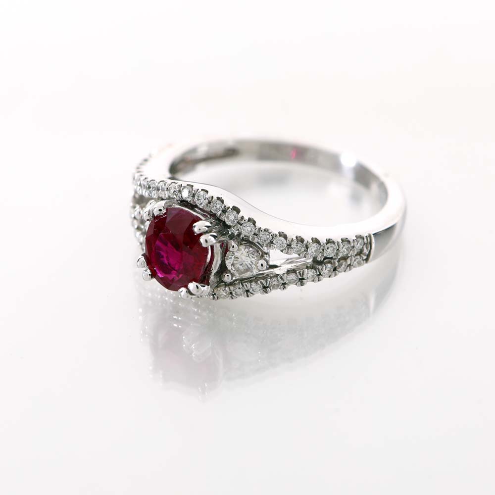 Anello in oro, rubino e brillanti Oro bianco 750/000. Rubino in taglio ovale...