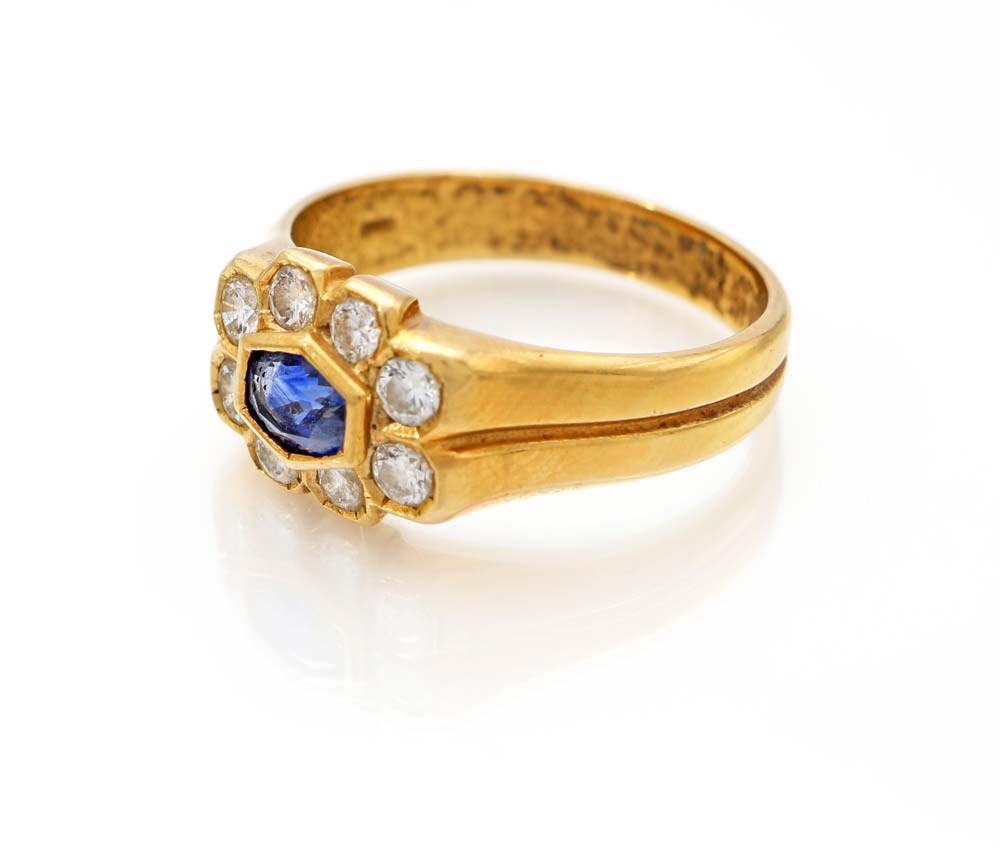 Lot 252 | Anello in oro, zaffiro e brillanti Oro giallo 750/000. Zaffiro in taglio...