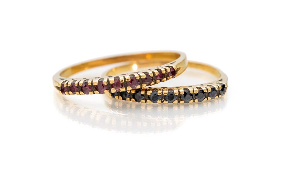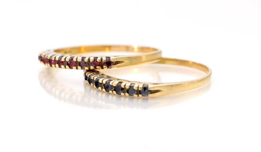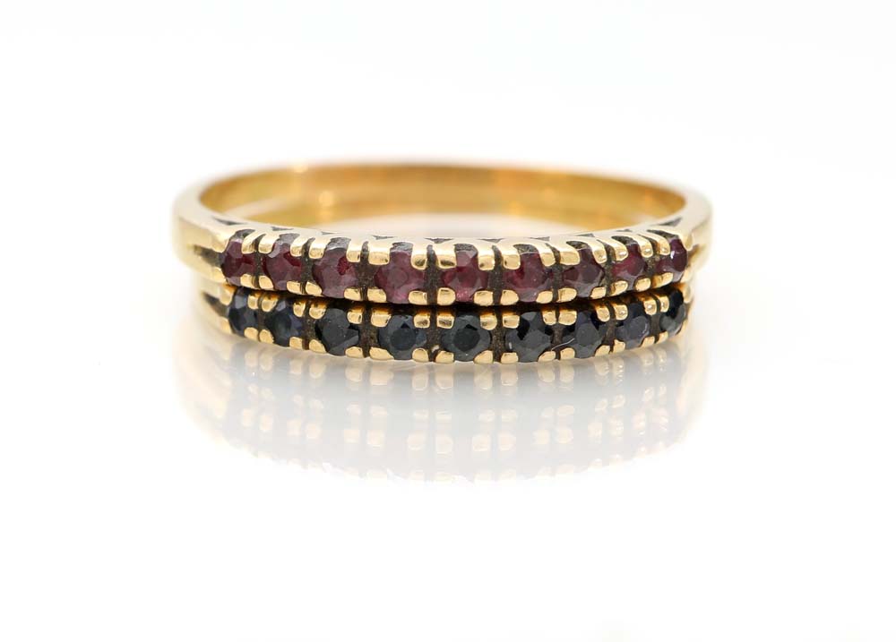 Coppia di fedi in oro, zaffiri e rubini Oro giallo 750/000. Peso complessivo gr. 4,50 Misura 21