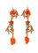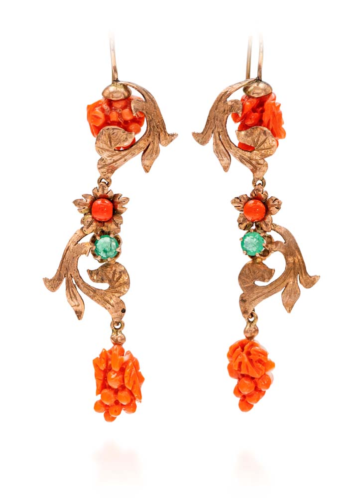 Coppia di orecchini in oro, smeraldo e coralli Oro giallo a basso titolo. Peso complessivo gr. 12,60.