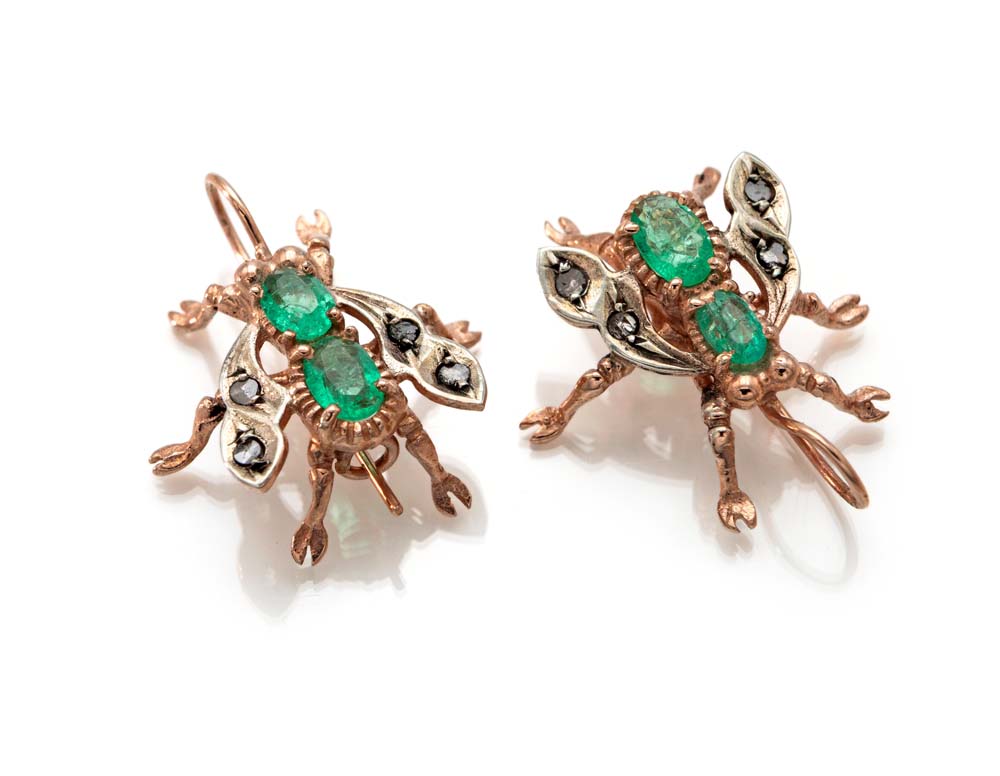 Coppia di orecchini in oro, argento, smeraldi e diamanti Oro a basso titolo, argento. Peso complessivo gr. 5,70. cm 2,5 x 2