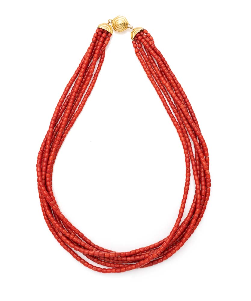 Torchon in oro e corallo Oro giallo 750/000 Peso complessivo gr 66 Lunghezza cm 48