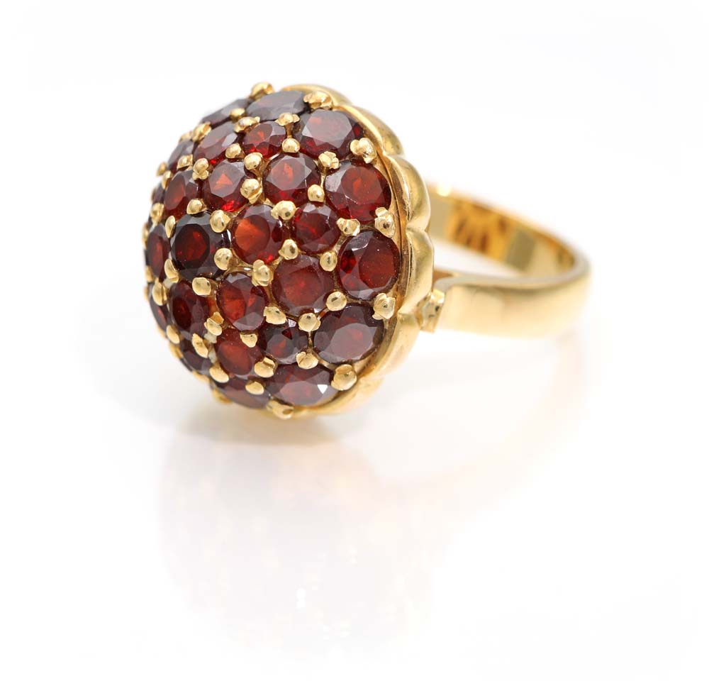 Anello in oro e granati Oro giallo 750/000. Peso complessivo gr. 16,50. Misura 16
