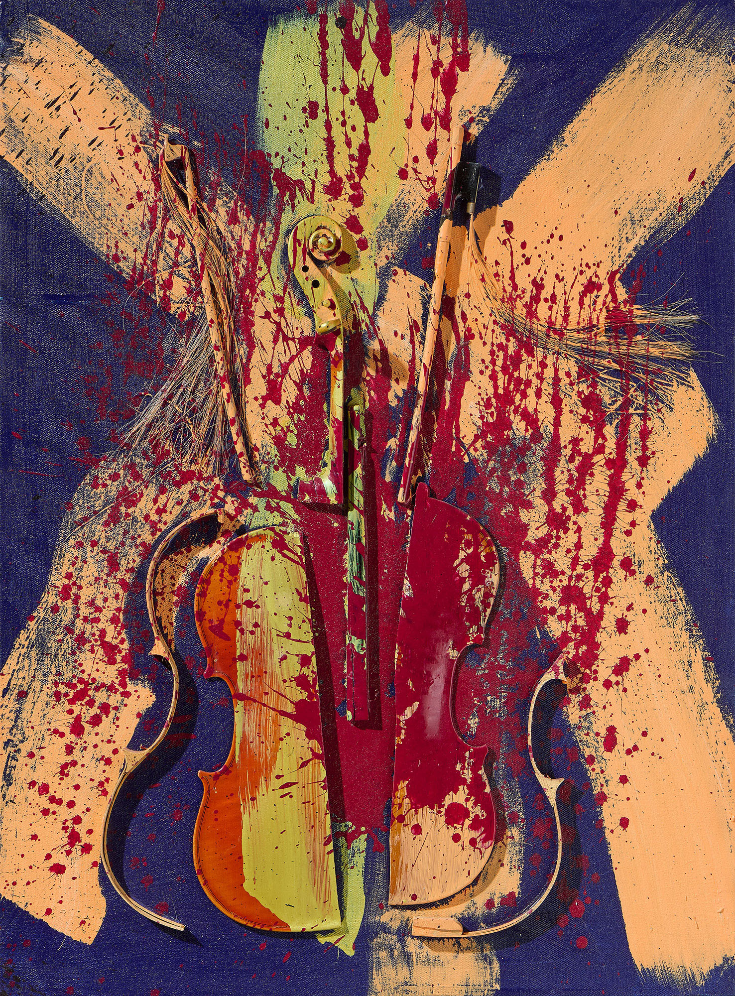 Violino sezionato e acrilico su tela tesa su tavola, cm 81,6x60,7
