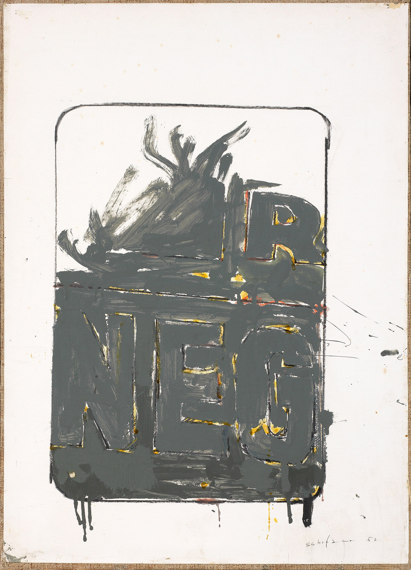 Firma e data in basso a destra: Schifano 62. Al verso, su un cartone di supporto: etichetta e timbro Galleria del Minotauro, Brescia / Esposto in galleria dal 1.10.1968 al 25.10.1968.