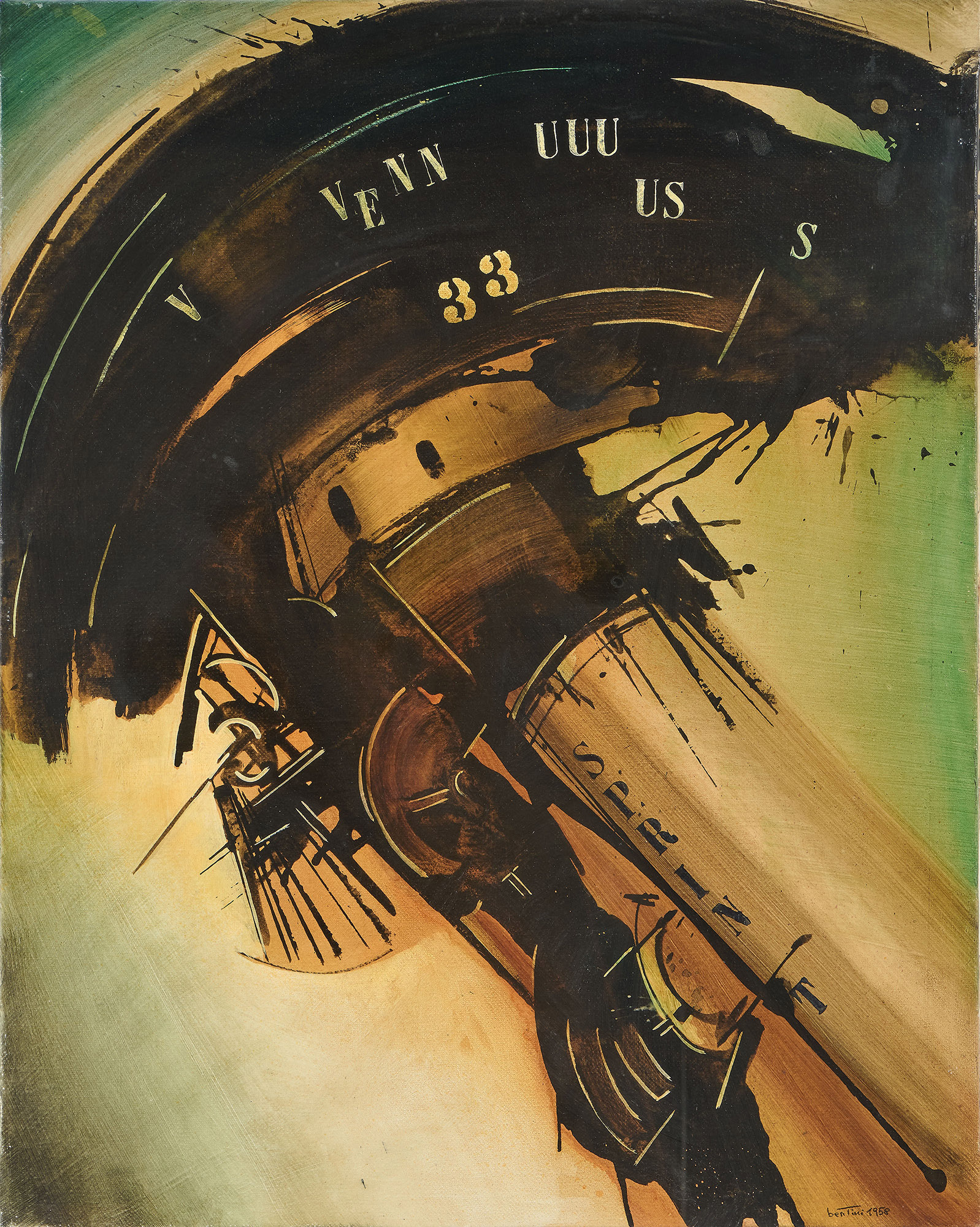 Firma e data in basso a destra: Bertini 1958; firma, data, titolo e numero al verso sulla tela: Bertini 1958 / "Il Re Antigone" / 12NS-VII I8.