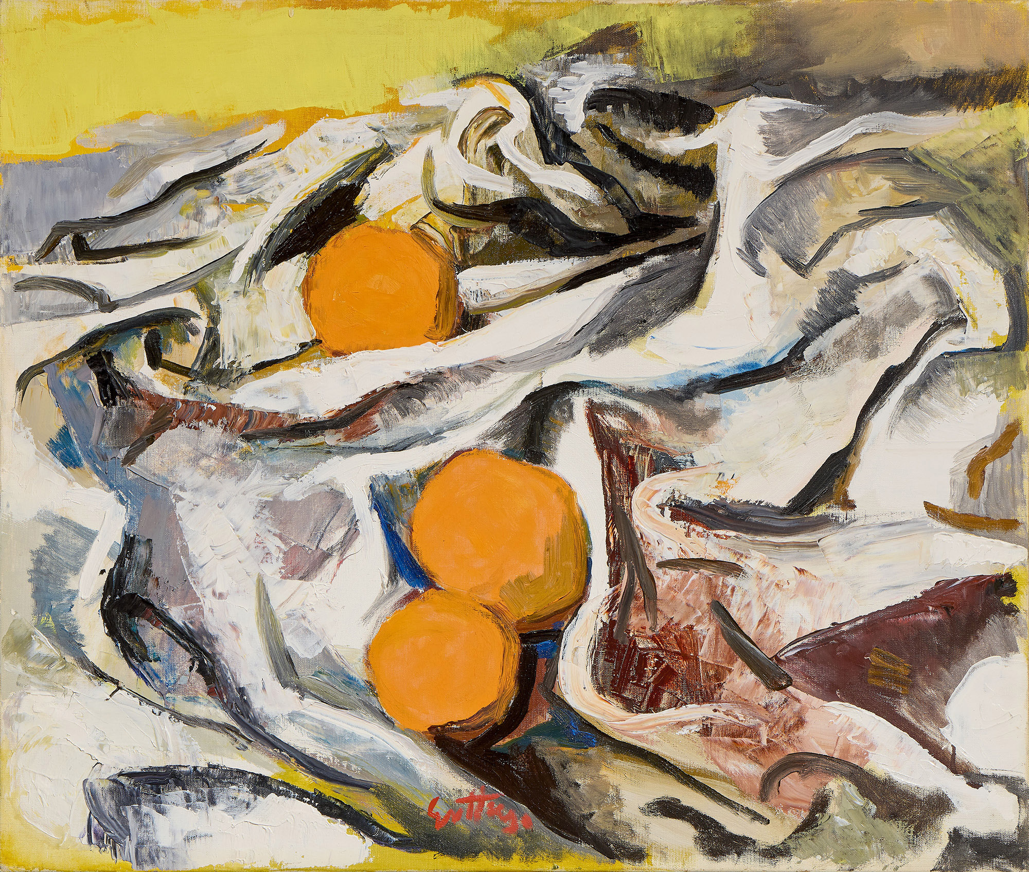 Renato Guttuso (Bagheria (Pa), 1912 - Roma, 1987) Arance e drappo, 1960 Olio...