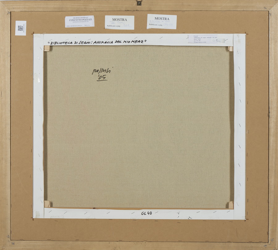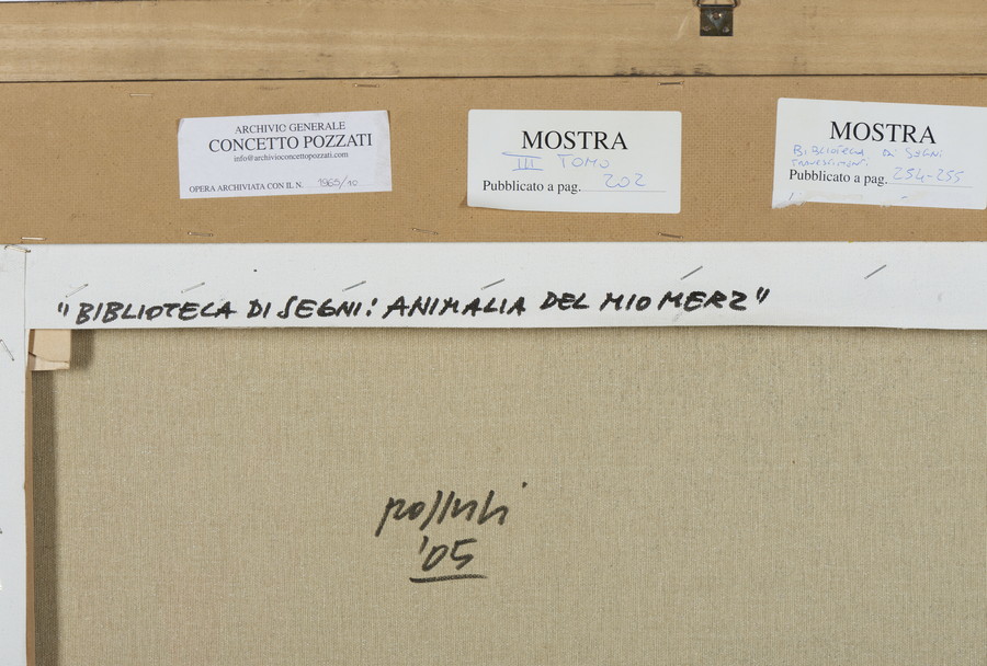 POZZATI CONCETTO (1935 - 2017) BIBLIOTECA DI SEGNI: ANIMALIA NEL MIO MERZ. 2005. Tecnica mista su tela. Cm 80,00 x 70,00. sul retro : firma, data e titolo