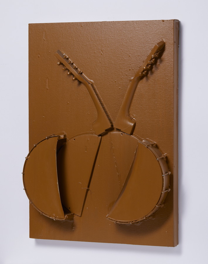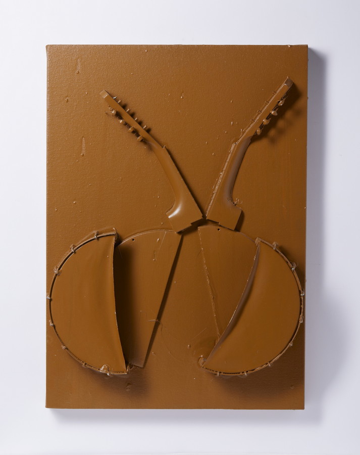 ARMAN FERNANDEZ (1928 - 2005) SENZA TITOLO. 1998. banjo tagliato su tela montata su tavola con pittura acrilica terra di Siena chiara. Cm 50,00 x 71,00 x 4,50. firma
