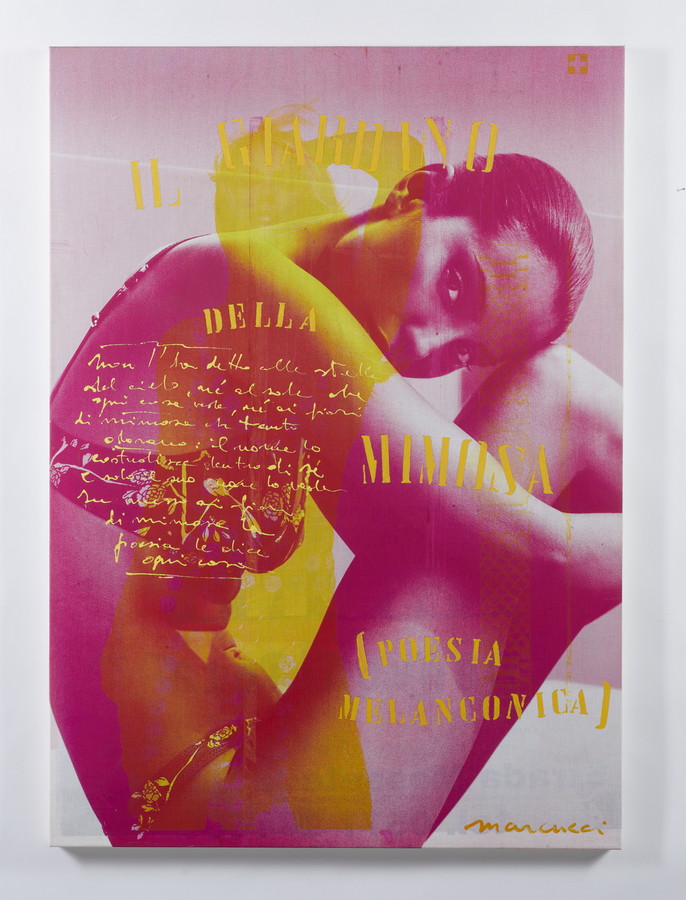 MARCUCCI LUCIA (n. 1933) IL GIARDINO DELLA MIMOSA (POESIA MELANCONICA). 2004. Tempera su tela computerizzata. Cm 118,50 x 166,00. firma