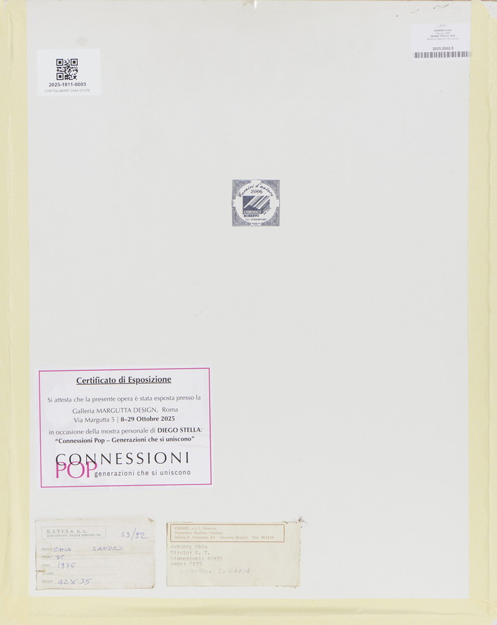 L'opera è accompagnata da certificato di archiviazione a cura dell'Archivio Chia riportante la firma dell'artista