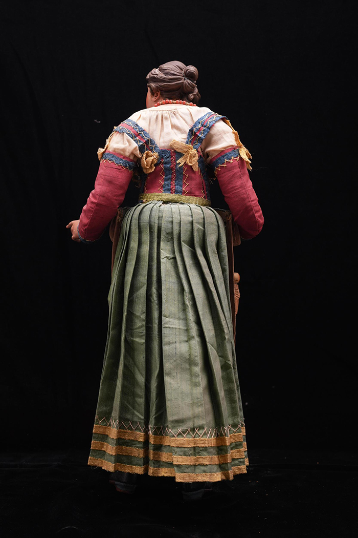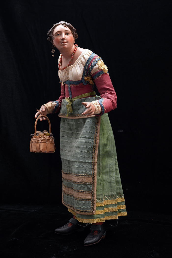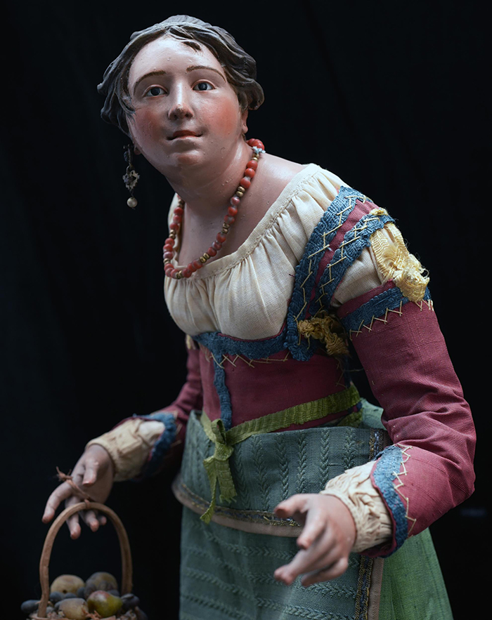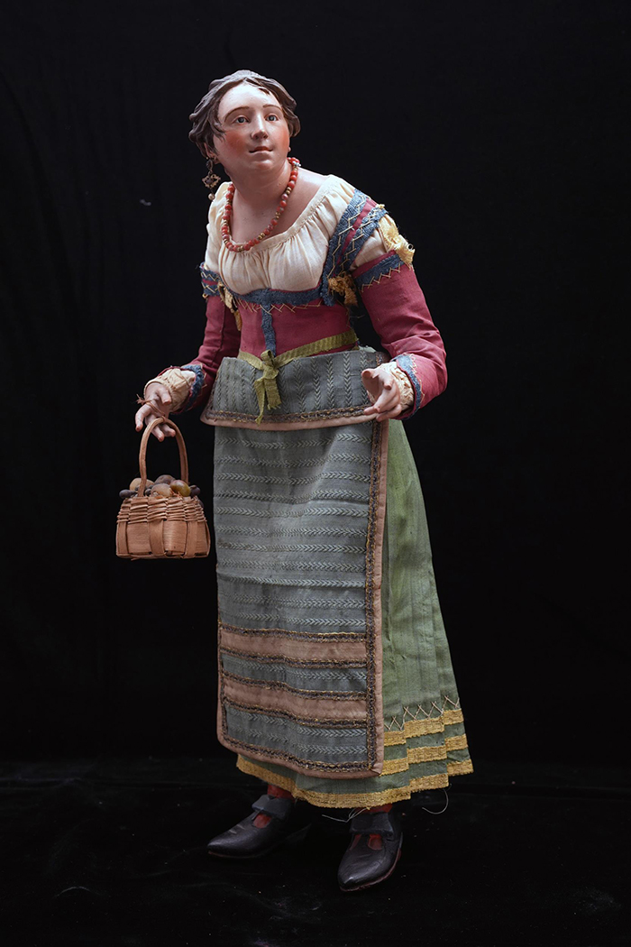Popolana attr. N. Somma h cm 37,5 accessori: collana in corallo; cestino con frutta Napoli XVIII - XIX secolo