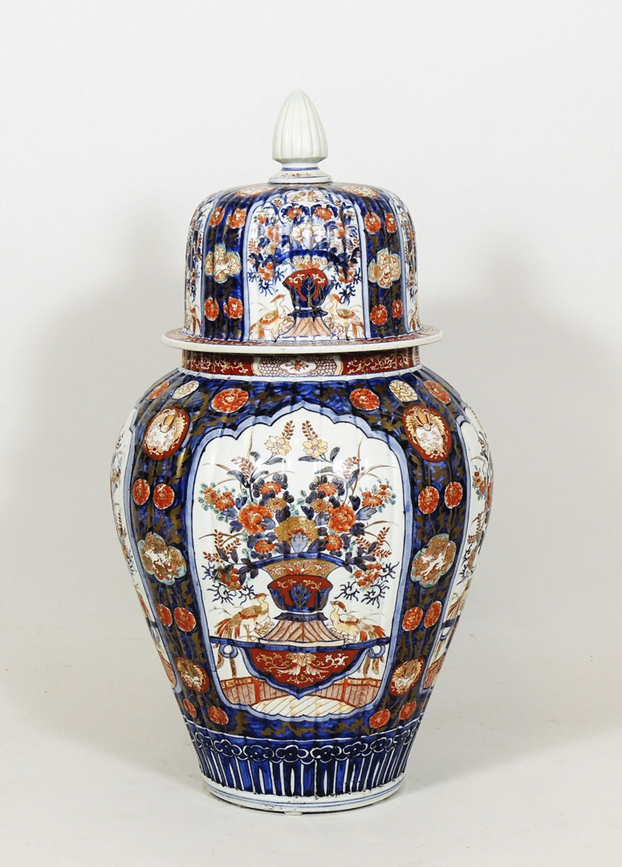 POTICHE IN PORCELLANA IMARI Giappone dipinta con fenici e vasi di fiori entro riserve sagomate su fondo nei toni del blu, rosso e oro h cm 80 PAINTED PORCELAIN LIDDED VASE, JAPAN