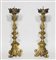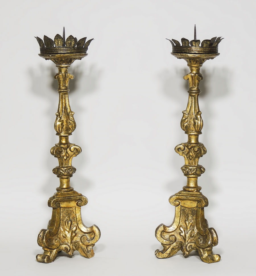 COPPIA DI TORCIERE IN LEGNO INTAGLIATO E DORATO XVIII secolo fusto a balaustro intagliato con volute e foglie d'acanto, base a tripod su tre piedi a ricciolo h cm 54 PAIR OF GILTWOOD PRICKETS, 18TH CENTURY