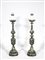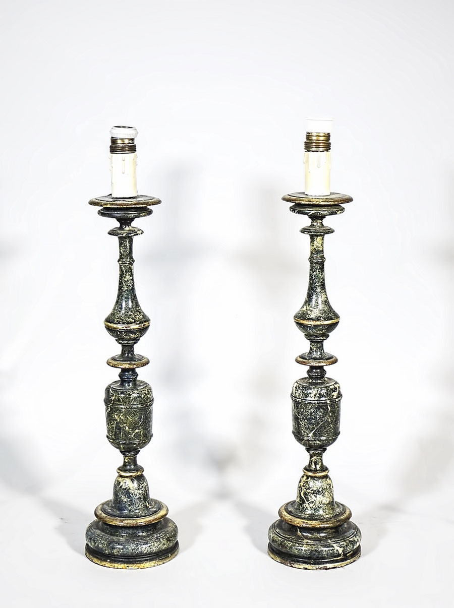 COPPIA DI LUMI IN LEGNO LACCATO A FINTO MARMO fusto tornito, lumeggiature in...