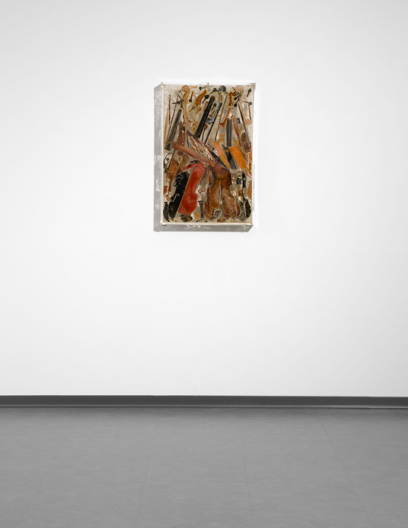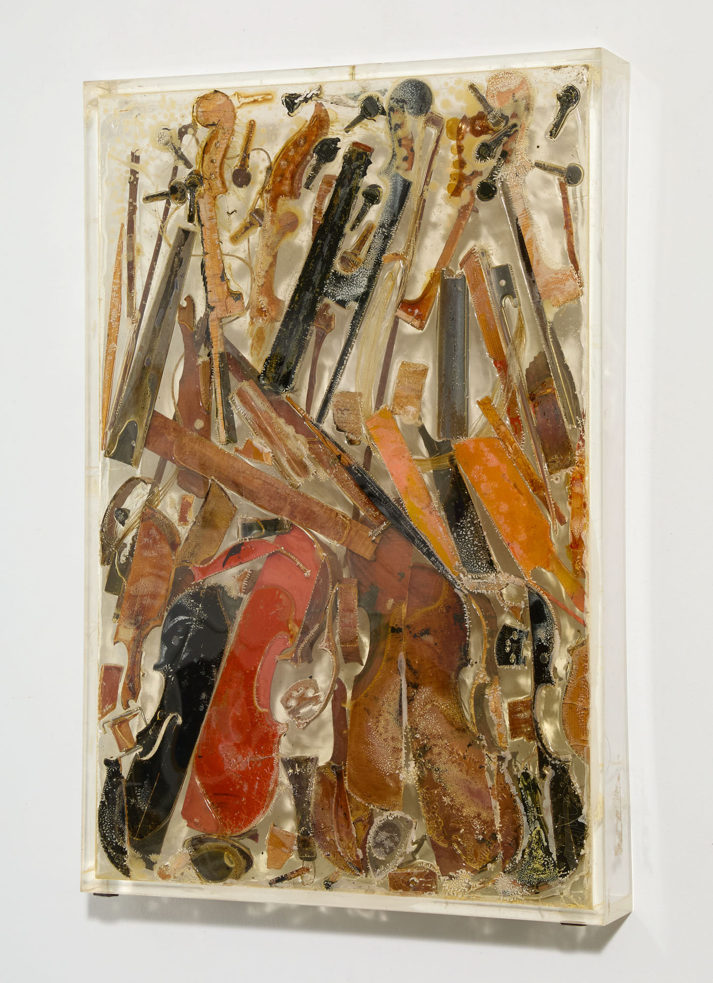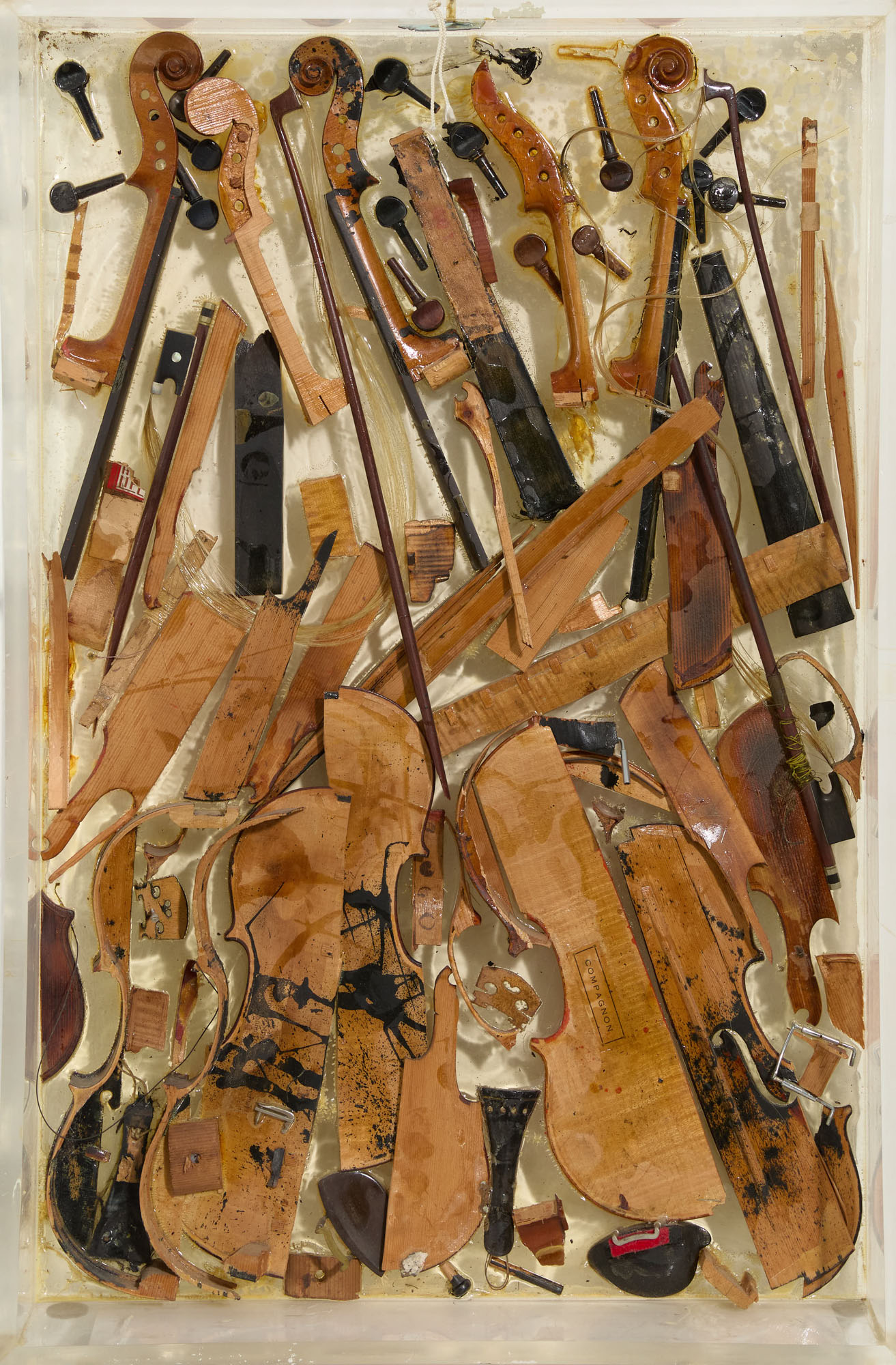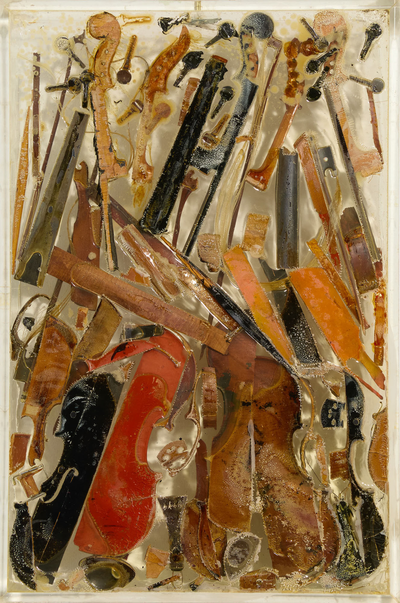 Accumulazione di violini entro plexiglas, cm 90 x 60 x 11