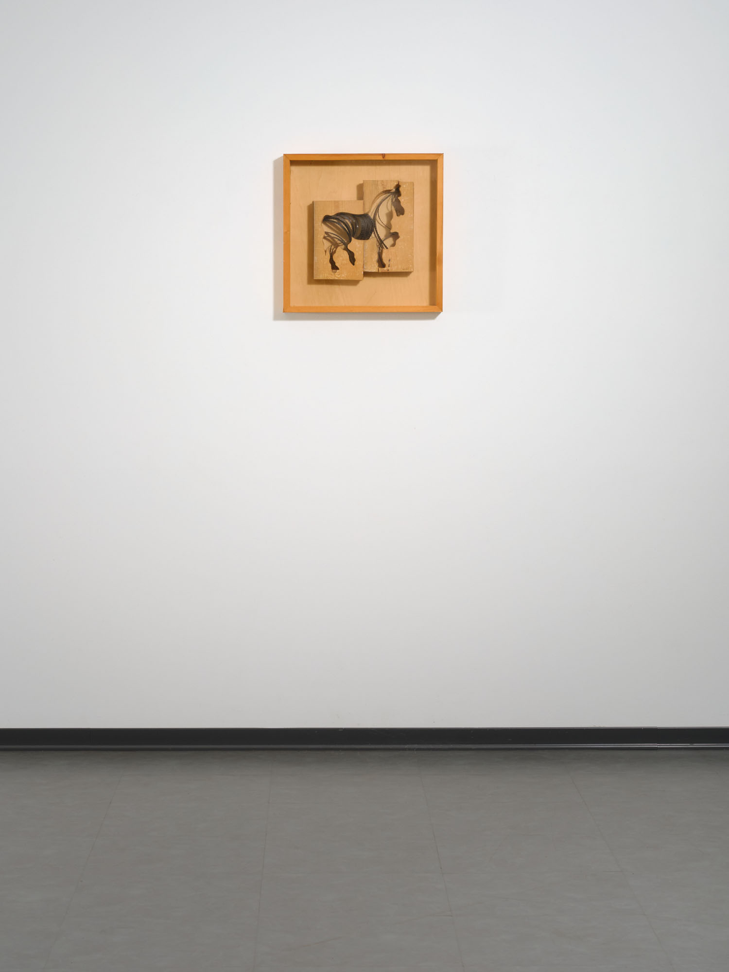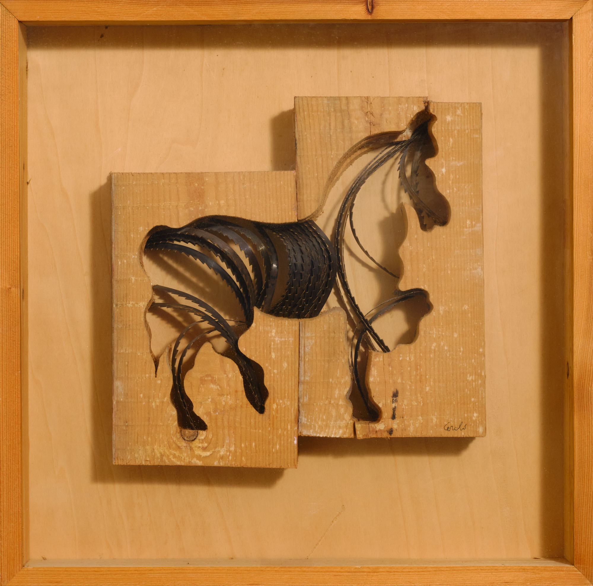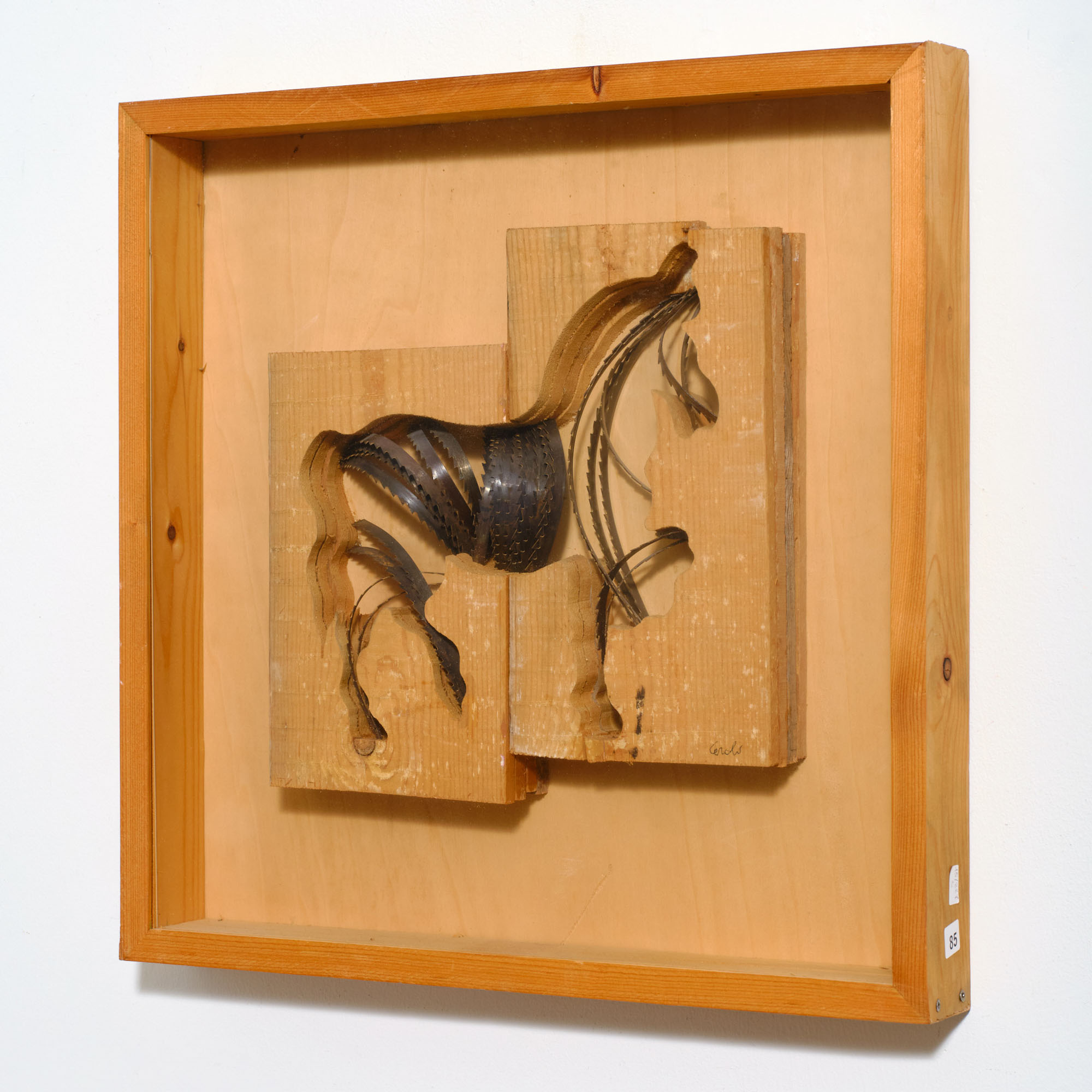 Scultura in legno ed elementi in ferro su tavola, cm 55 x 55,5