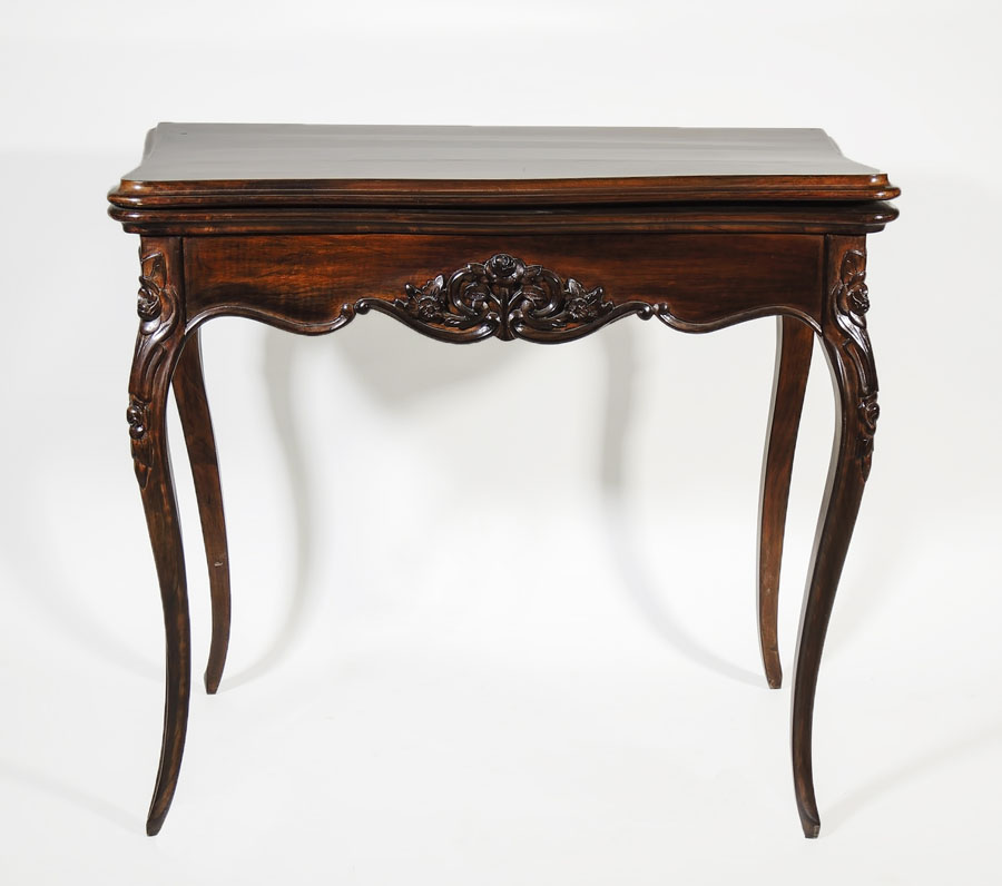 TAVOLINO DA GIOCO A LIBRO IN MOGANO seconda metà del XIX secolo fascia intagliata con motivi floreali, gambe mosse aperto h cm 70x80x80 MAHOGANY FOLD OVER TOP CARD TABLE, SECOND HALF OF 19TH CENTURY