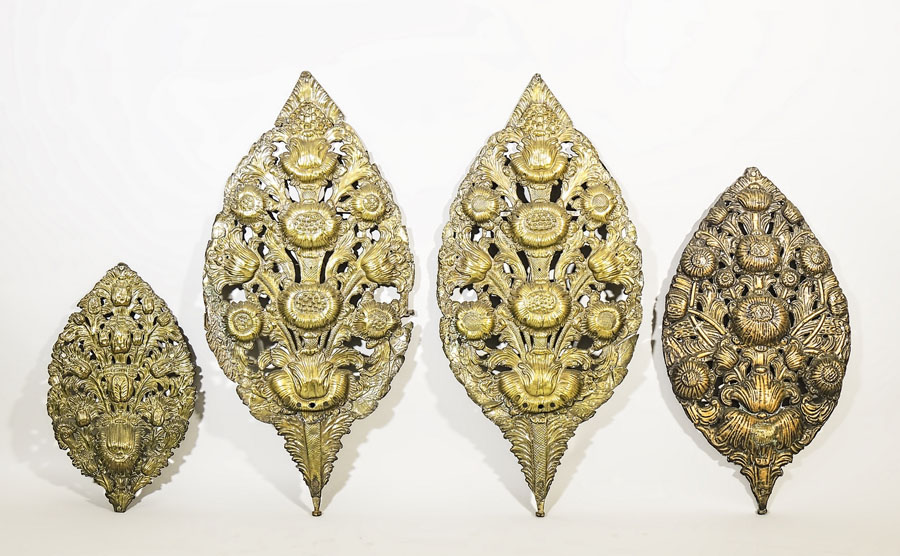 SERIE DI TRE VENTOLE IN RAME sbalzate con motivi floreali, realizzate a forma di scudo ed un'altra simile, difetti, h cm 80 A SET OF FOUR COPPER FRIEZES