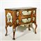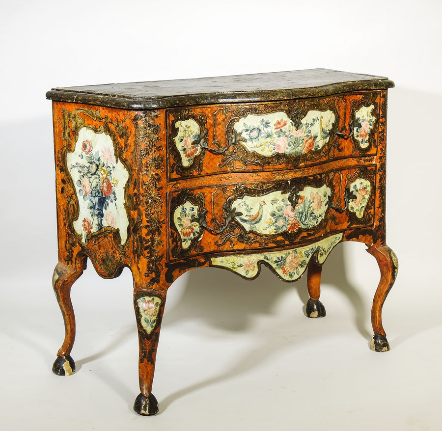 PICCOLO CASSETTONE IN LEGNO LACCATO E IN PARTE DORATO A MECCA Sicilia, XVIII secolo fronte mosso a due cassetti, dipinto con trionfi di fiori e uccellini entro riserve su fondo rosso, piano dipinto a finto marmo, gambe mosse, alcuni difetti h cm 91x107x53 SMALL LACQUERED AND PARTIALLY GILTWOOD CHEST OF DRAWERS, SICILY, 18TH CENTURY