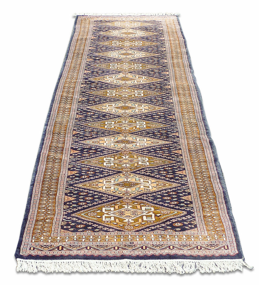 TAPPETO GALLERIA PERSIANO fondo blu notte, campo con losanghe e disegni...