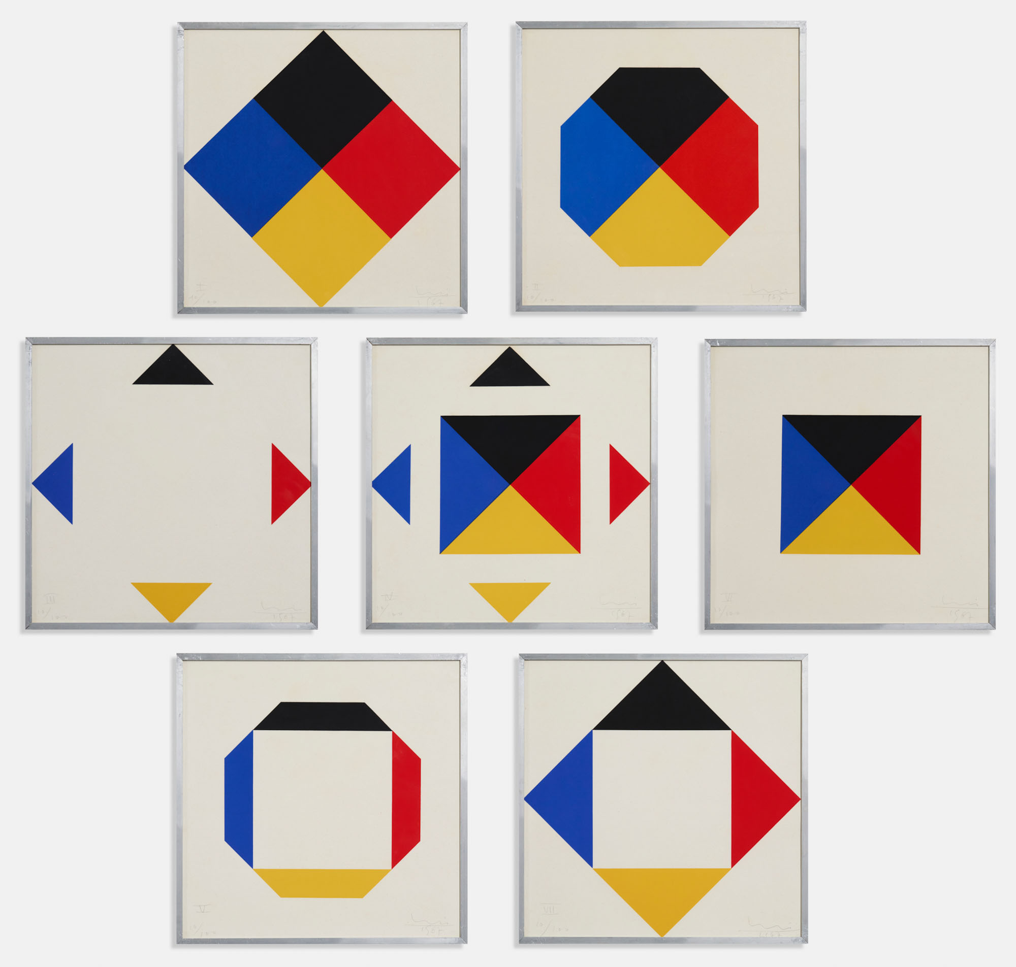 7 serigrafie su carta, cm 40 x 40 cad.