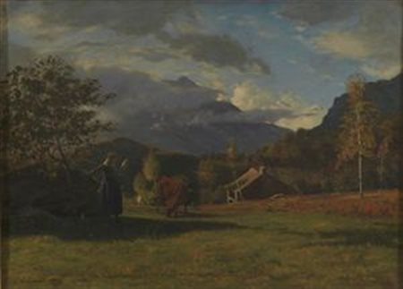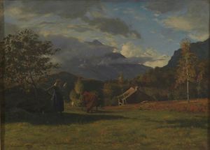 CALDERINI LUIGI Torino 1880 - 1973 Filatrice al pascolo Olio su tela, 47x65 cm Firma in basso a sinistra Già Galleria Fogliato, Torino, etichetta al retro