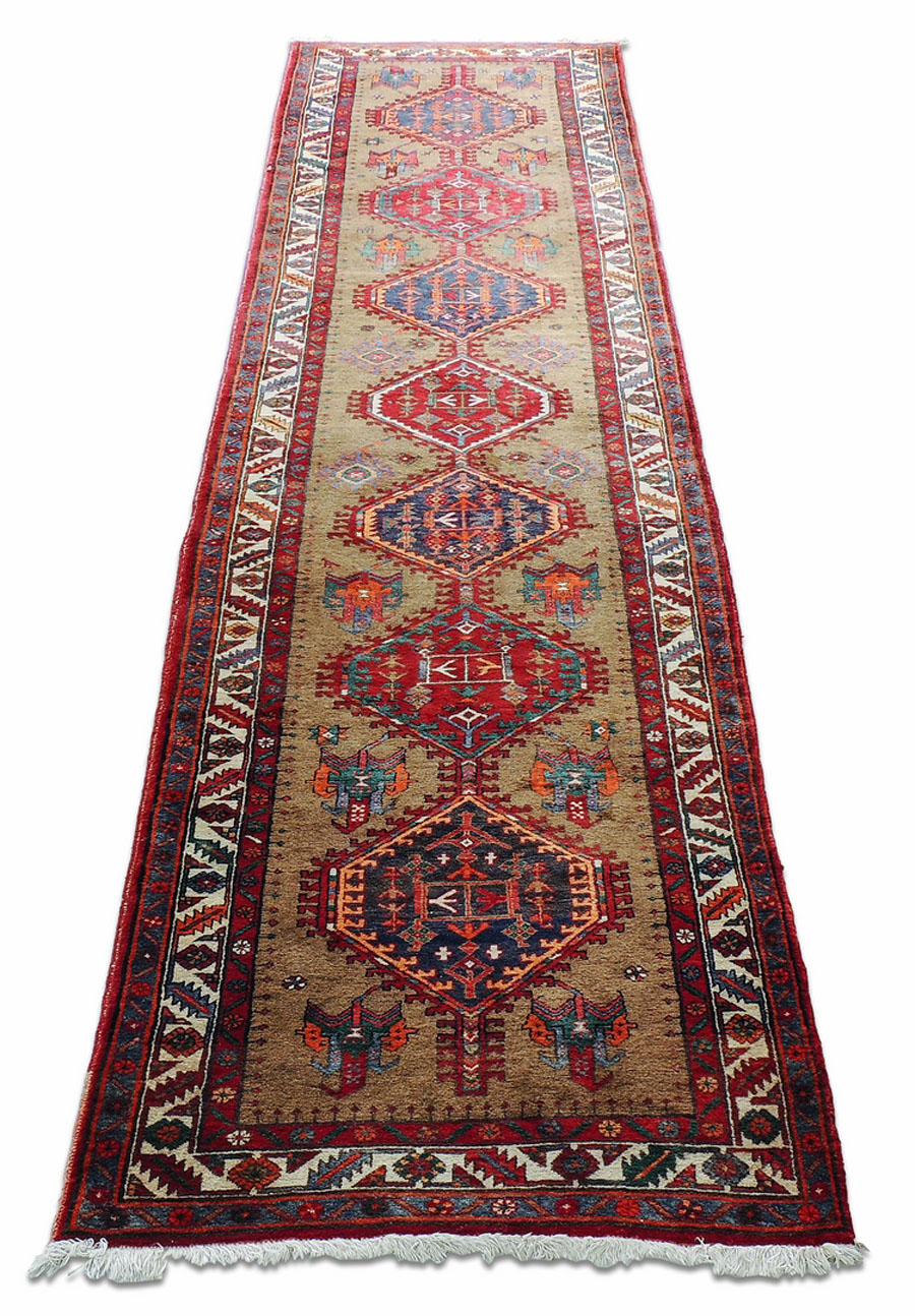 TAPPETO GALLERIA CAUCASICO fondo beige, campo con sette medaglioni e disegni stilizzati nei toni del rosso, arancio, verde e blu cm 103x455 LONG CAUCASIC CARPET