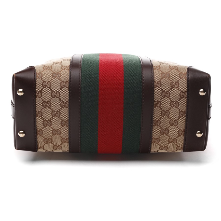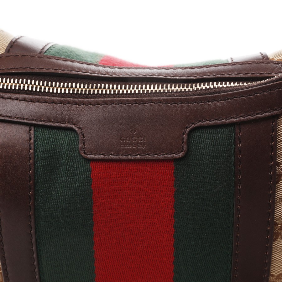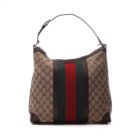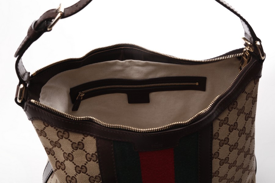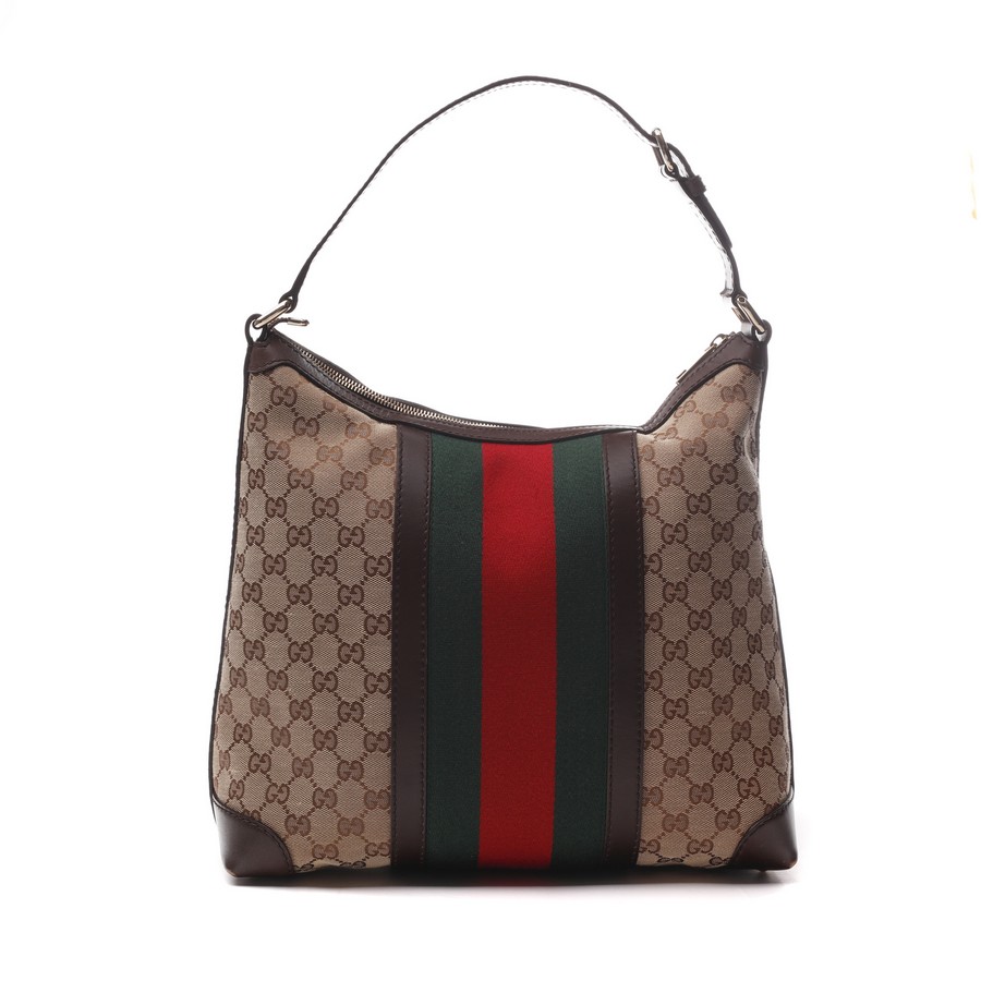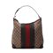 GUCCI Borsa Hobo . Tessuto e pelle. Cm 32,00 x 31,00 x 15,00. Borsa in tessuto logo Gucci e fascia motivo web centrale.