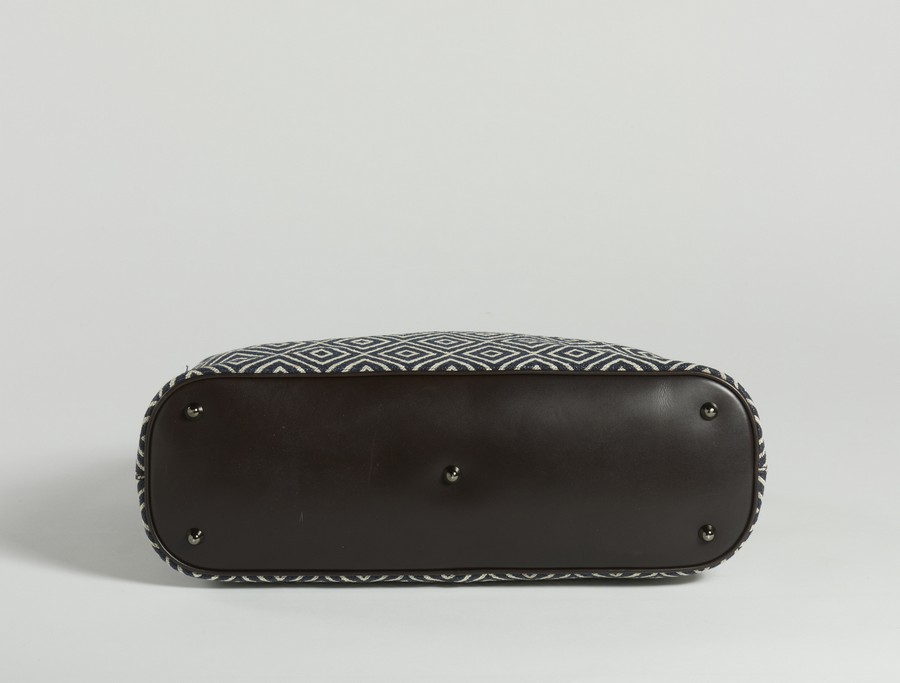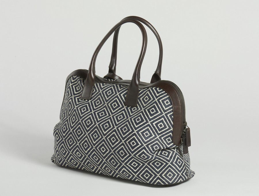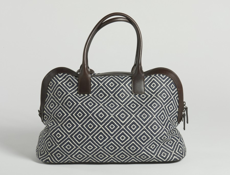 FERRAGAMO SALVATORE Borsa Weekend fantasia geometrica blu e marrone. Tessuto e pelle. Cm 45,00 x 30,00 x 20,00.