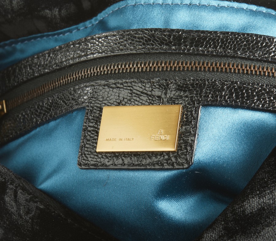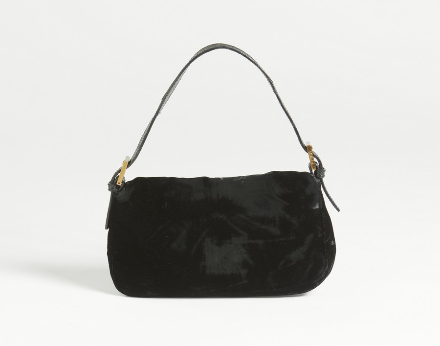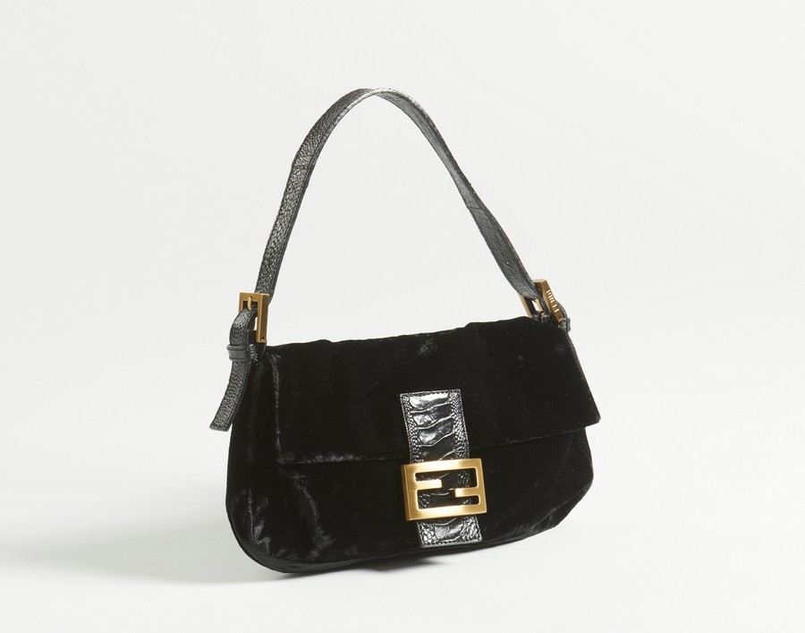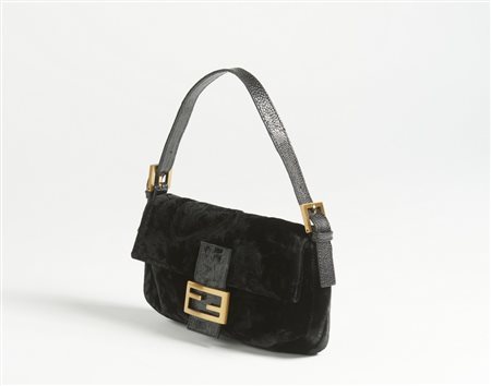 FENDI Borsa modello baguette. Velluto. Cm 28,00 x 16,50. Borsa modello baguette in velluto nero con manici e dettagli in pelle nera stampa cocco. Hardware dorati.