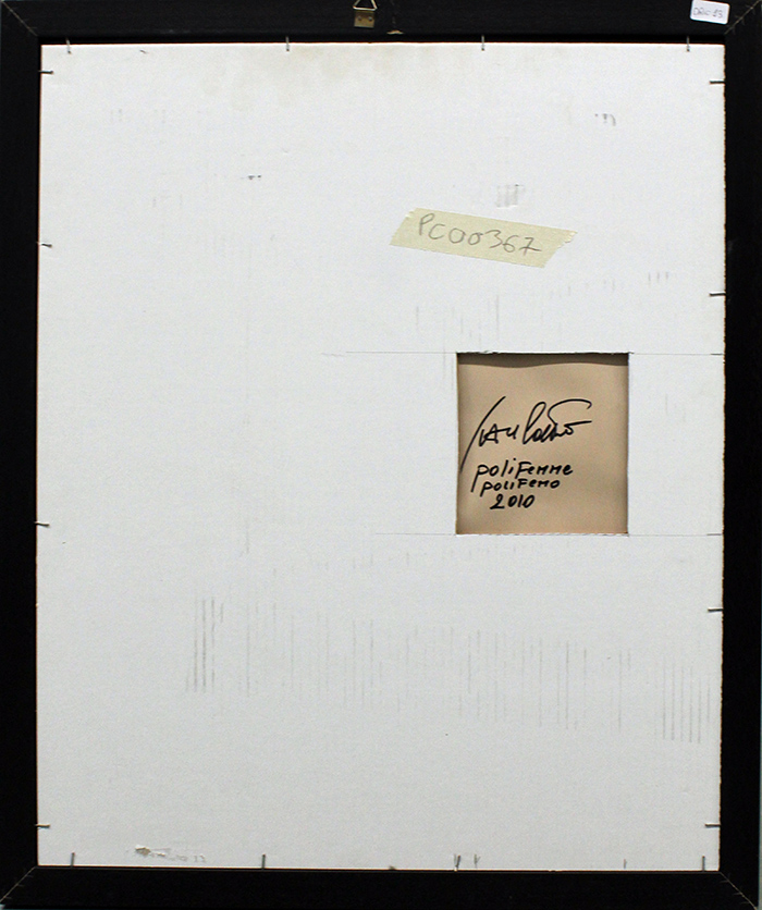 IVAN CATTANEO, "Poli-femme, Polifemo", 2010, tecnica mista e collage su cartoncino, dim 60x50, opera con autentica. Al fronte: titolo tratto da una scritta in collage. Al verso: firma, titolo, anno. Opera con cornice e vetro protettivo