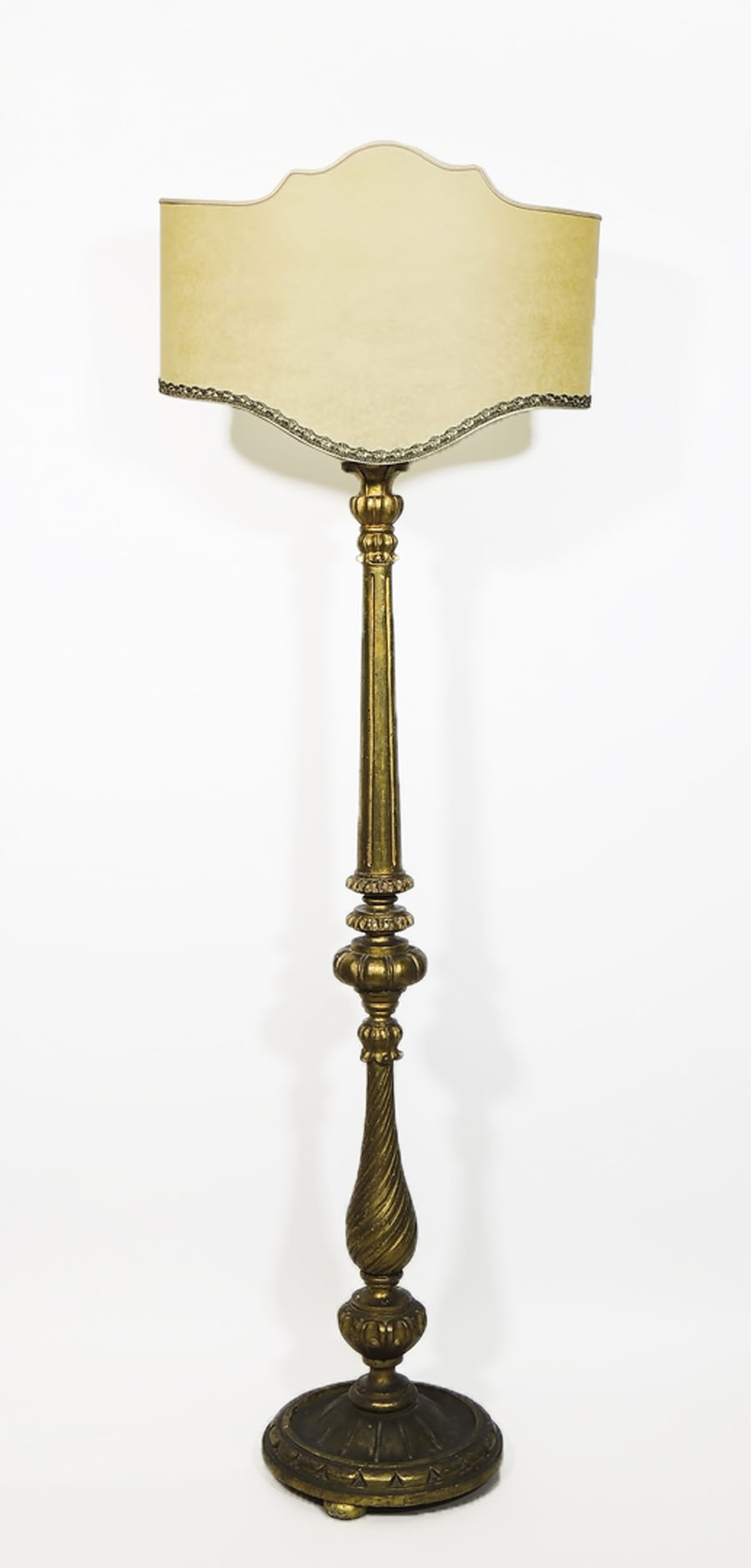PIANTANA D'EPOCA IN LEGNO INTAGLIATO E DORATO fusto scanalato e in parte tortile, base circolare su tre piedini a palla schiacciata, corredata da paralume in pergamena, h cm 150 GILTWOOD FLOOR LAMP