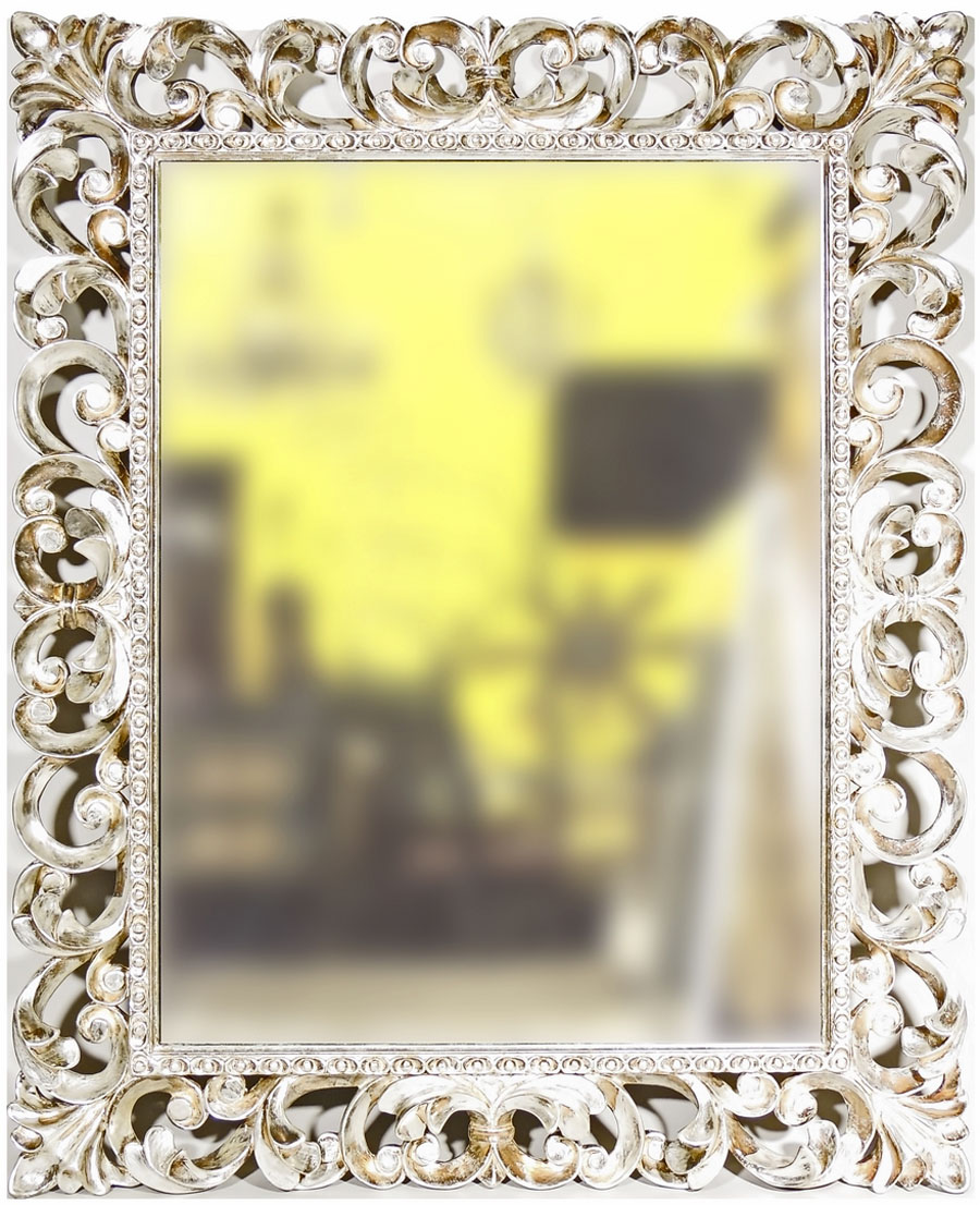 SPECCHIERA IN LEGNO TRAFORATO E ARGENTATO cornice decorata con volute cm 105x84,5 SILVER WOOD MIRROR