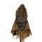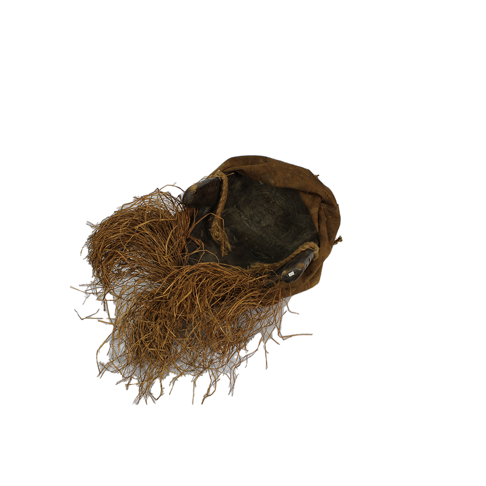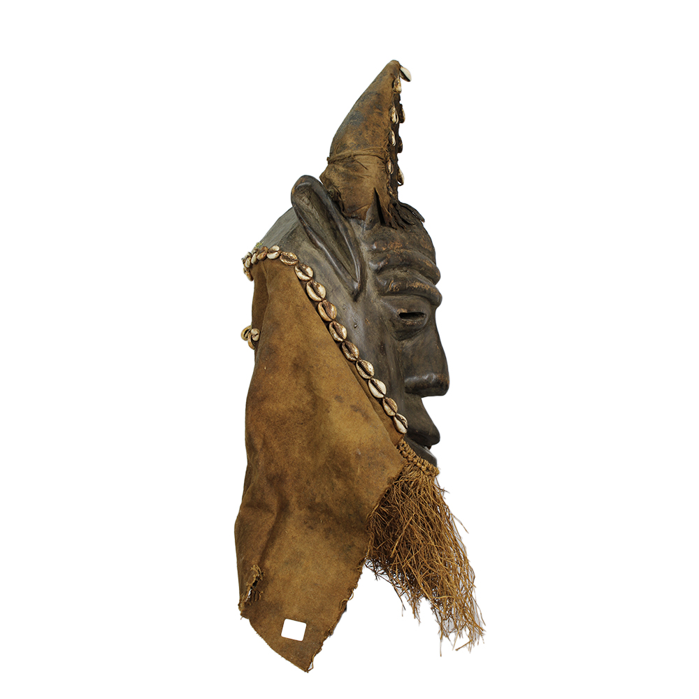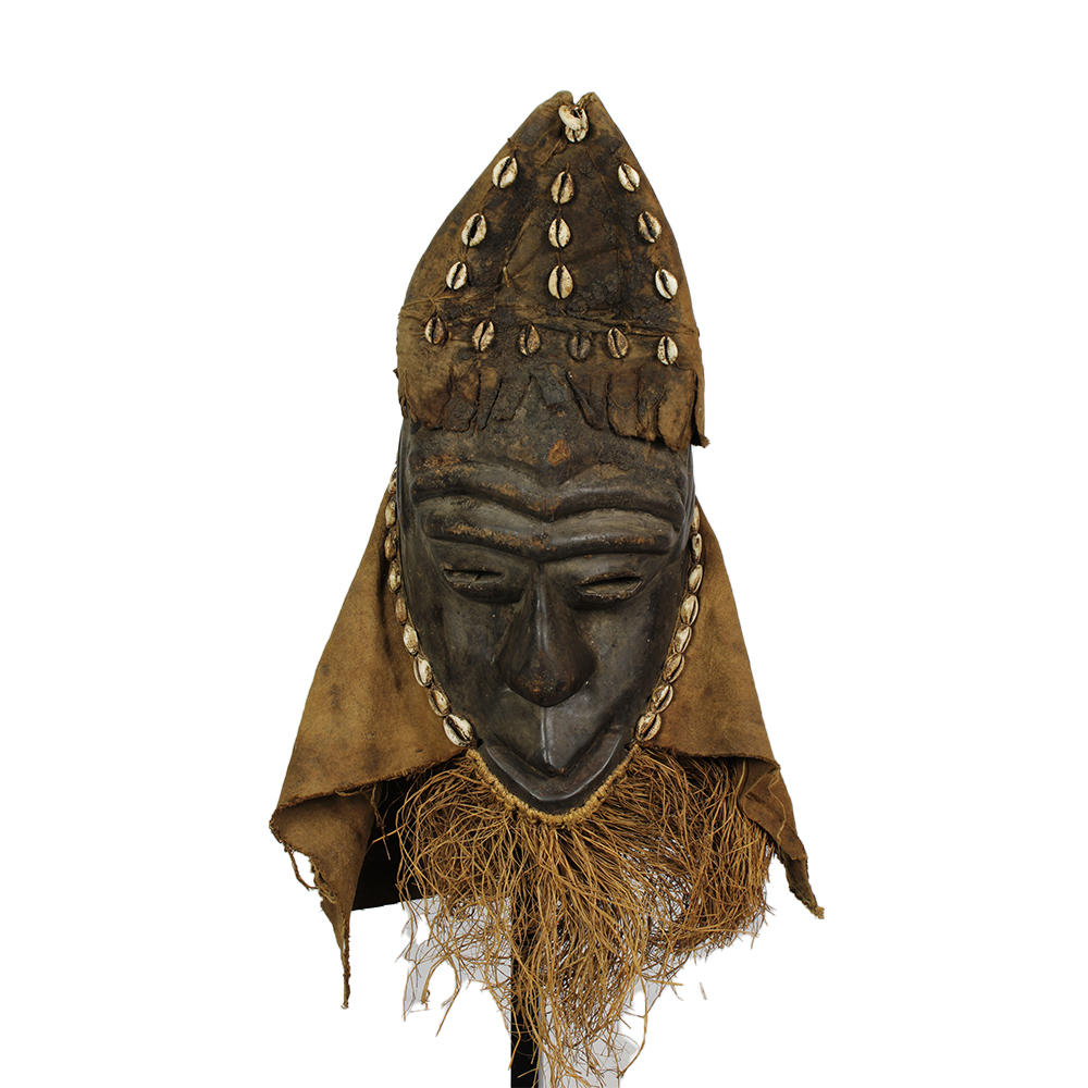 MASCHERA PORO dell'etnia Kissi in legno patina scura cauri tessuto e rafia, utilizzata nei moneti più' importanti della vita, dalle cerimonie di iniziazioni ai funerali. Guinea h cm 66 x 25 x 20