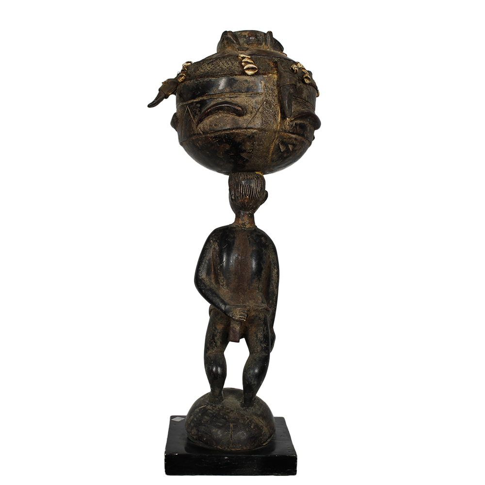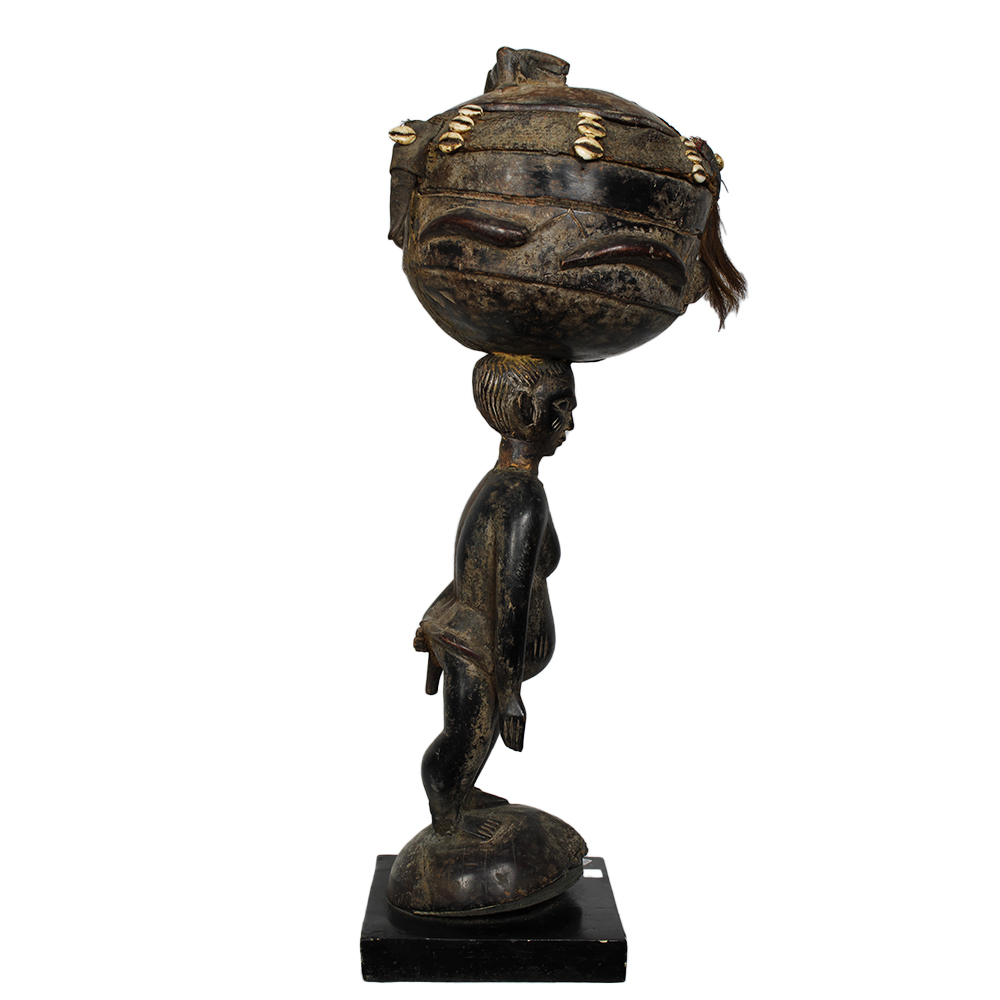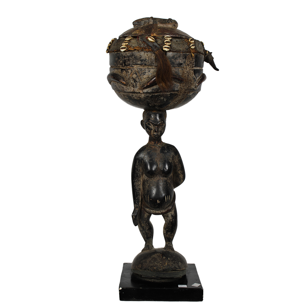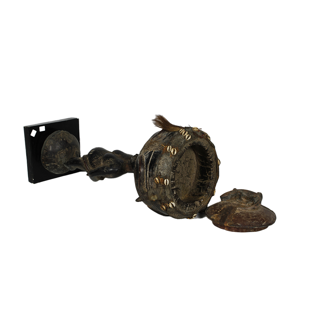 COPPA DIVINATORIA EWE in legno a patina nera, cauri, tessuto di rafia, peli e corna di animali. E' presente un doppiofondo in cui l'indovino nascondeva dei piccoli oggetti per impressionare il cliente che a lui si rivolgeva. Togo h cm 75 x 25 x 25