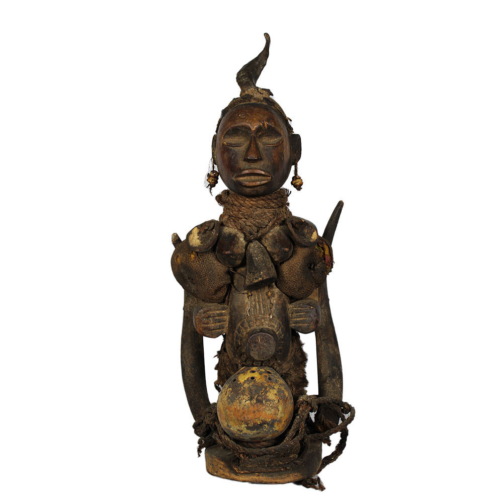 FETICCIO BOANGA etnia Songye in legno patina scura, corno di antilope, pelli di animali, fibre vegetali, agglomerati di sostanze rituali vari ed elementi metallici. Feticcio utilizzato dai guaritori Nganga. Repubblica democratica del Congo h cm 68 x 28 x 24