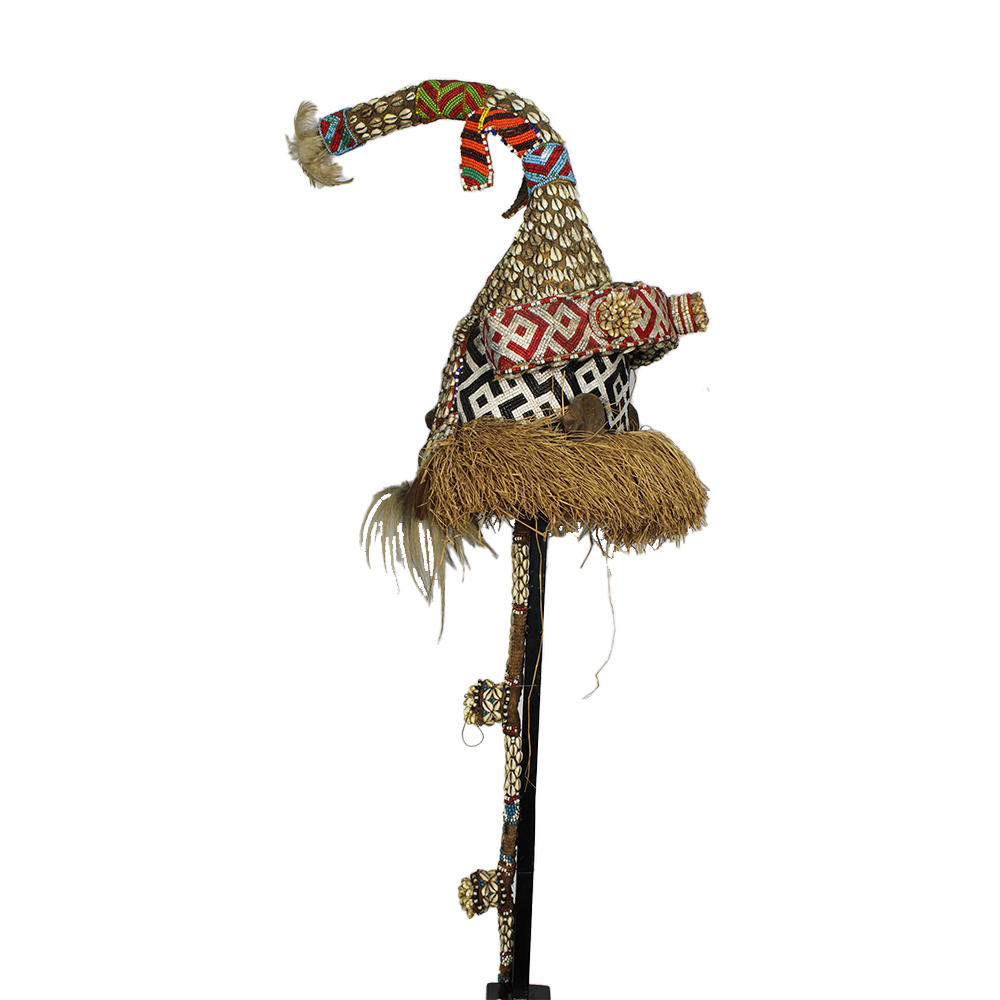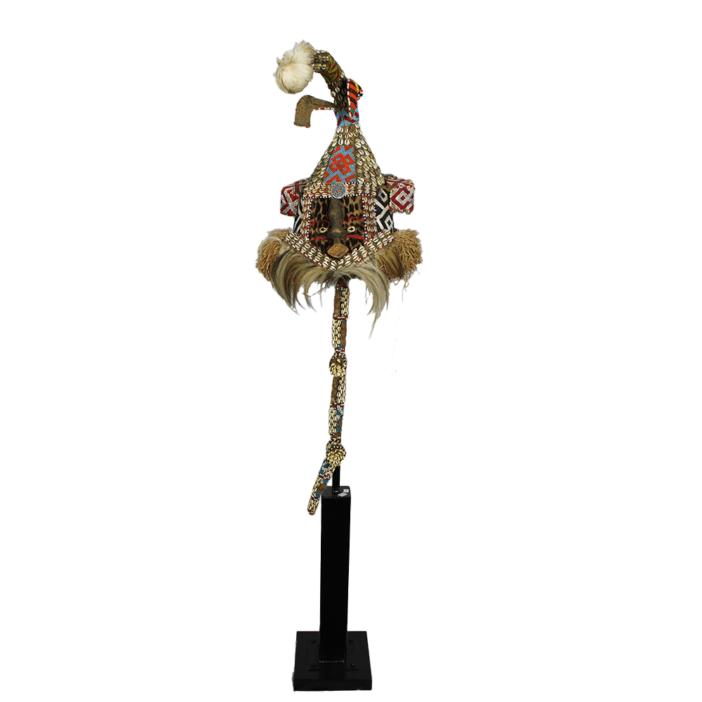 MASCHERA A CASCO MUKENGE DEGLI NGEENDE KUBA in vimini intrecciati, pelle di leopardo, rafia, cauri, perline di vetro, peli di colubus e pelli di uccello. Utilizzata da membri nobili per funerali di personaggi importanti, la particolare forma ricorda l'elefante, animale emblema reale. Inoltre la maschera ricorda Woot eroe epico creatore del mondo. Repubblica del Congo h cm 115 x 40 x 35