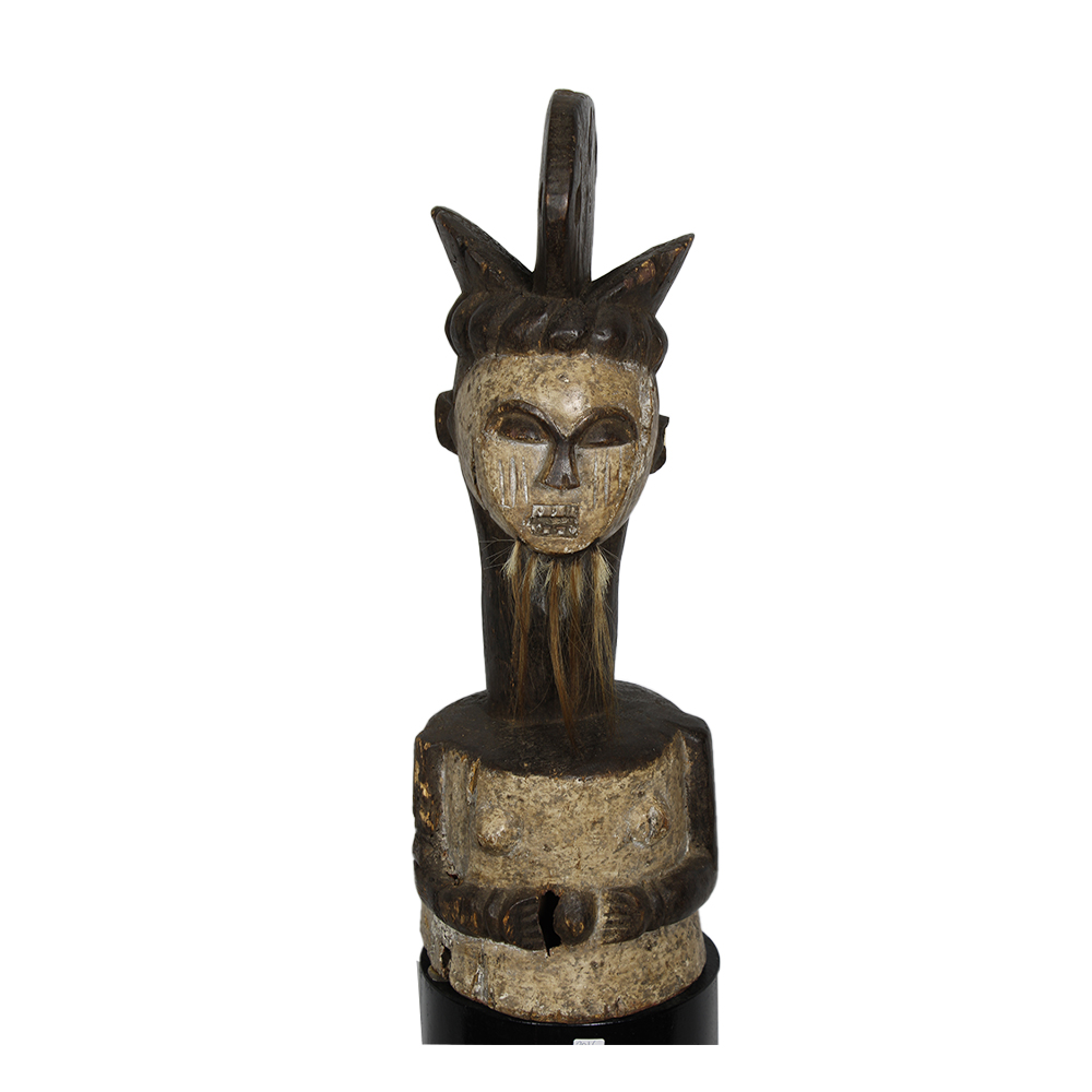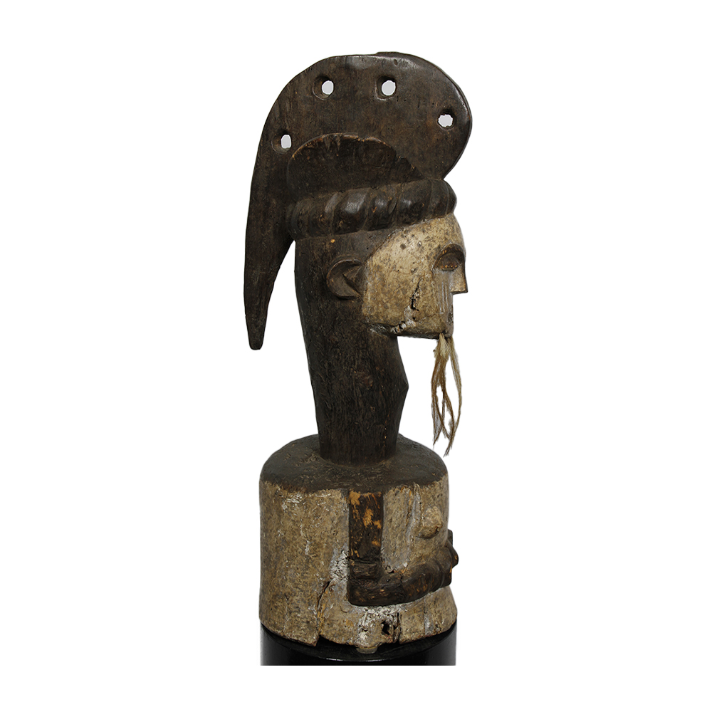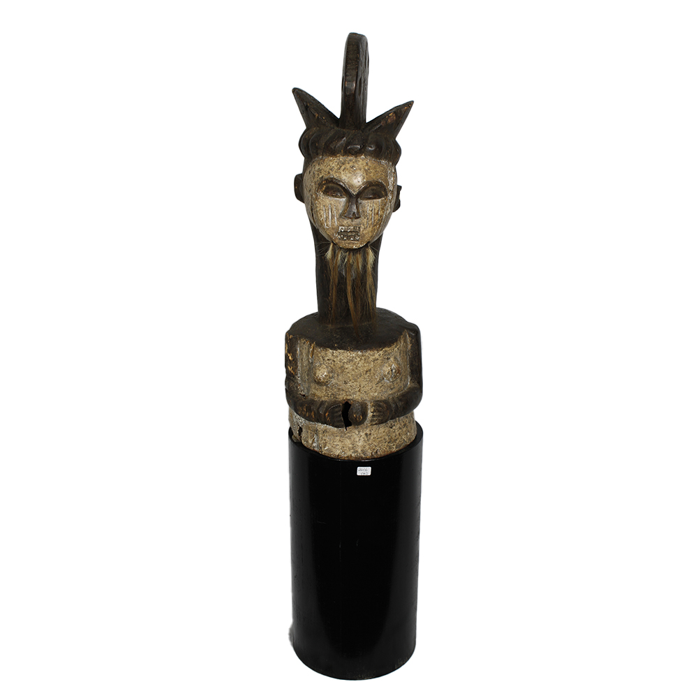 COPERCHIO ANTROPOMORFO DI SCATOLA RELIQUIARIO M'BETE in legno policromo e pelli di animali. Coperchio messo a capo di un contenitore per reliquie. Gabon h cm 63 x 22 x 23
