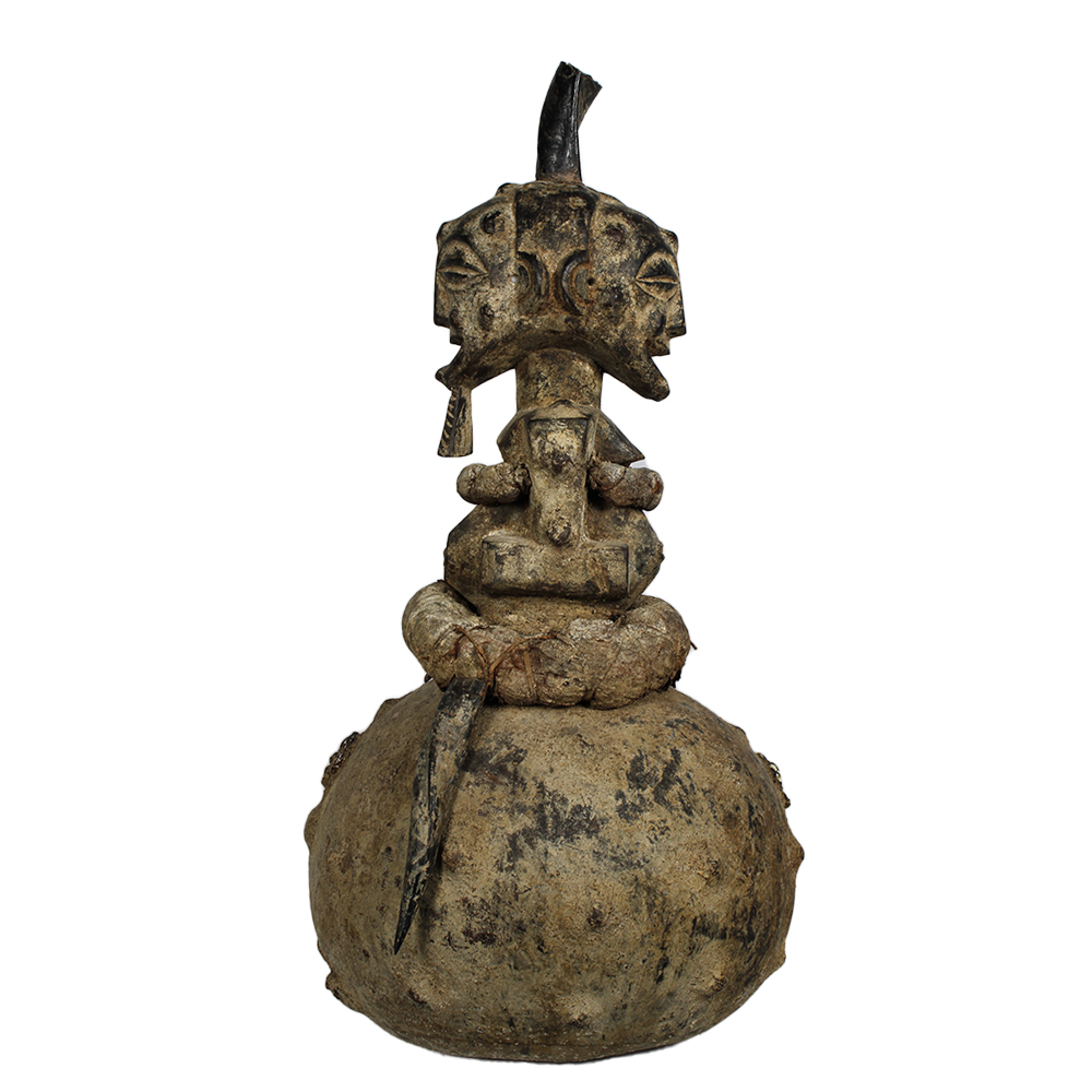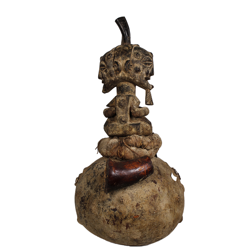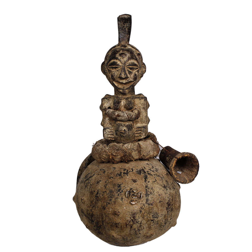 STRUMENTO MAGICO KABWELULU etnia Songye in legno patina scura caolino zucca corno di animale stoffa sostanze magiche e cauri. Strumento con parte in legno montato su una zucca per riti di iniziazione della società Bugabo. Repubblica democratica del Congo h cm 73 x 38