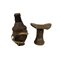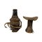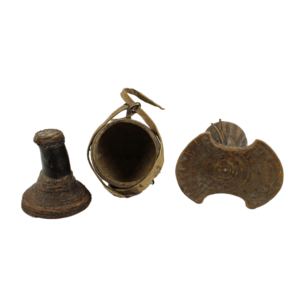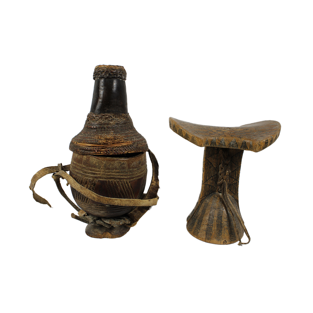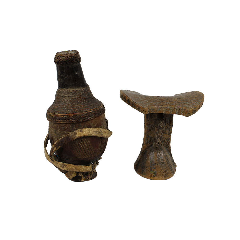 LOTTO COMPOSTO DA poggiatesta Karro' Hamer in legno inciso e cuoio e contenitore per il latte in legno cuoio fibre vegetali zucca pelli di animali e cauri, il poggiatesta è utilizzato dagli uomini in Etiopia del sud, per non rovinare le acconciature durante il riposo. Etiopia h cm 15 x 14 x 9,5 - h cm 22 x 10