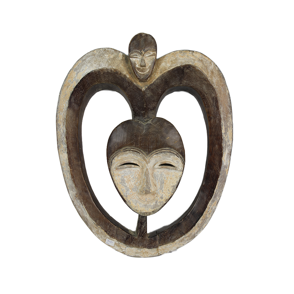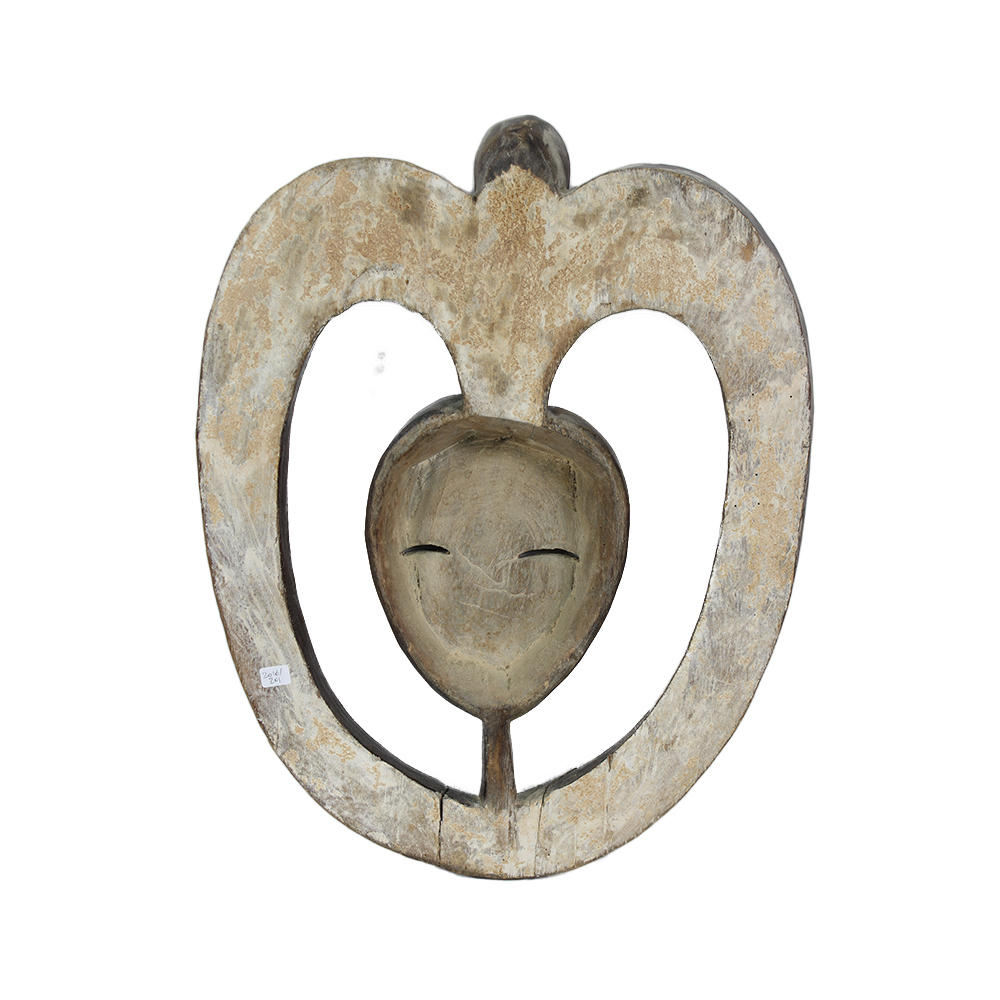 MASCHERA EKUK etnia Bakwele in legno patina scura e caolino, utilizzata per onorare gli spiriti della foresta veniva posta nei luoghi dove si praticava la ritualistica. Gabon e Congo h cm 55 x 42 x 5