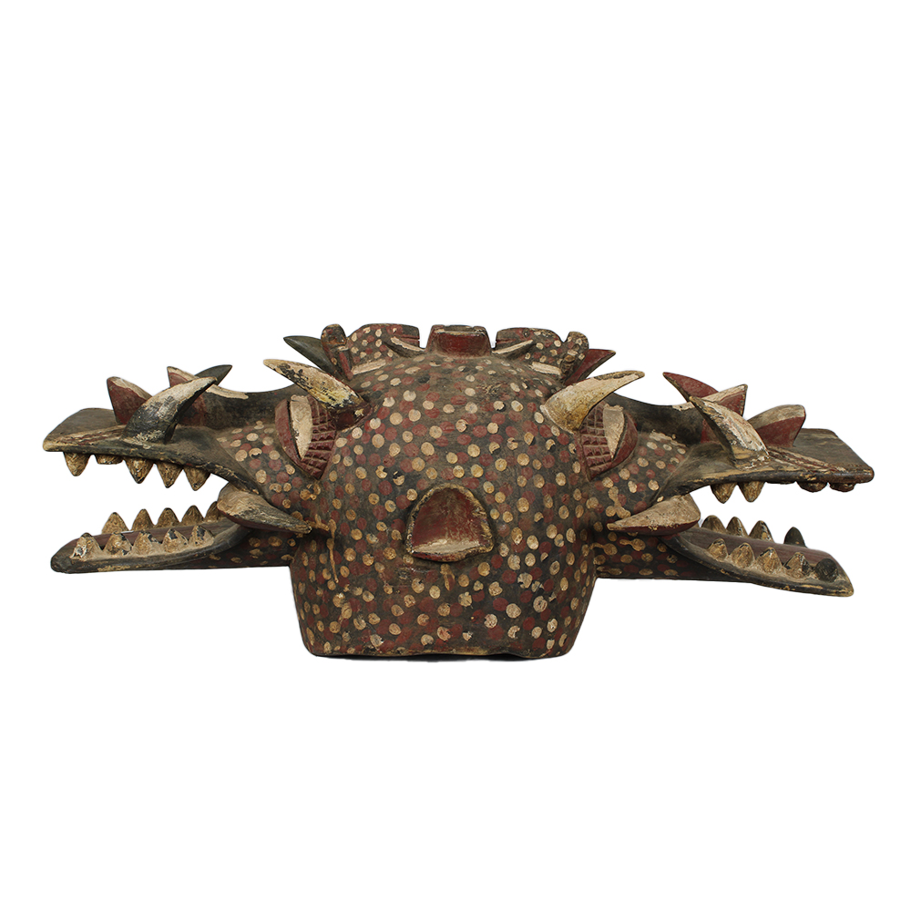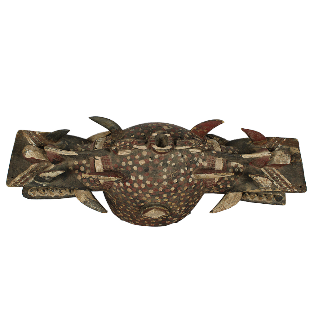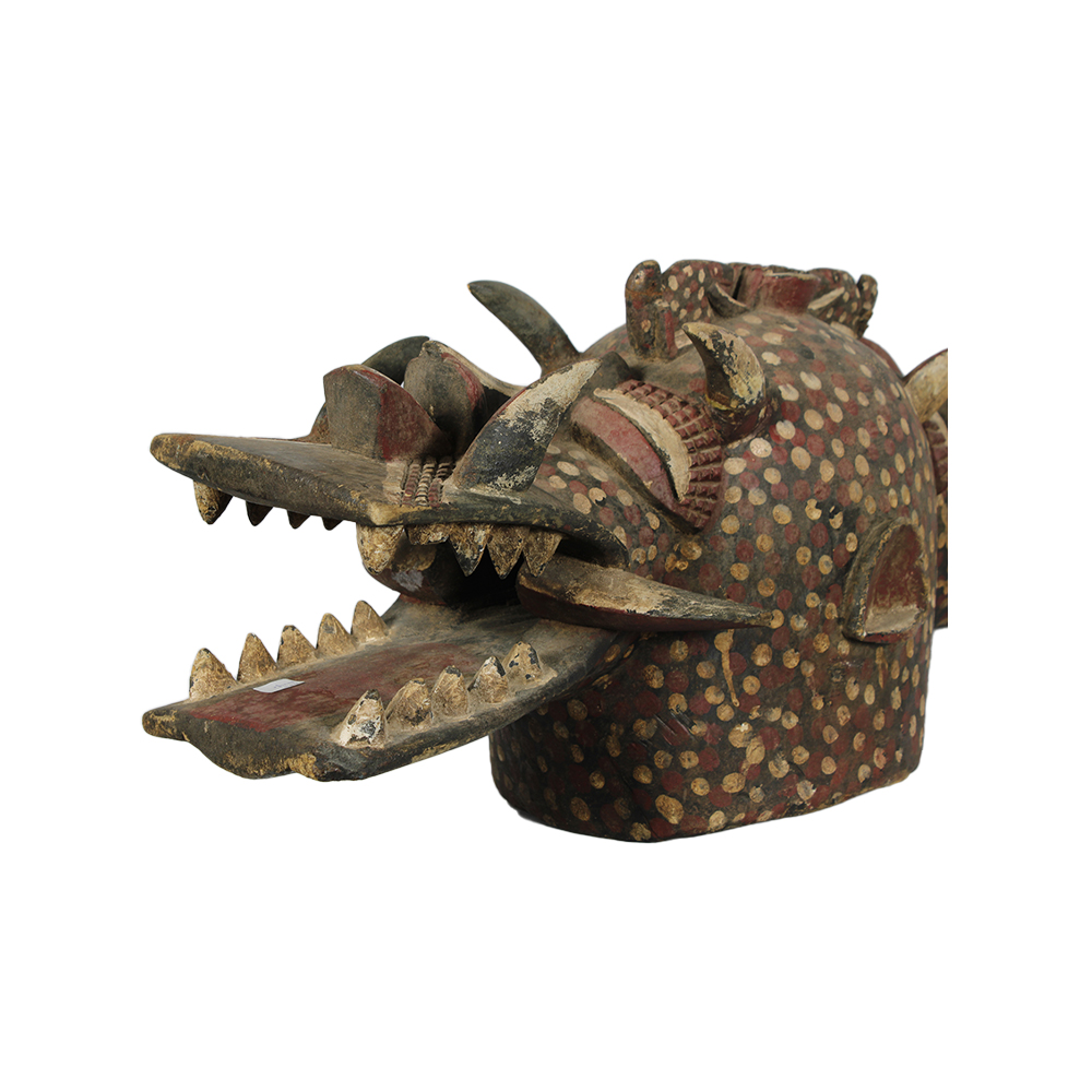 MASCHERA CASCO WANYUGO etnia senufo in legno con pigmenti bianchi rossi e neri, maschera zoomorfa della società segreta Wabale ha lo scopo di allontanare gli spiriti malvagi che disturbano le cerimonie di sepoltura. Costa D'Avorio h cm 35 x 81 x 25