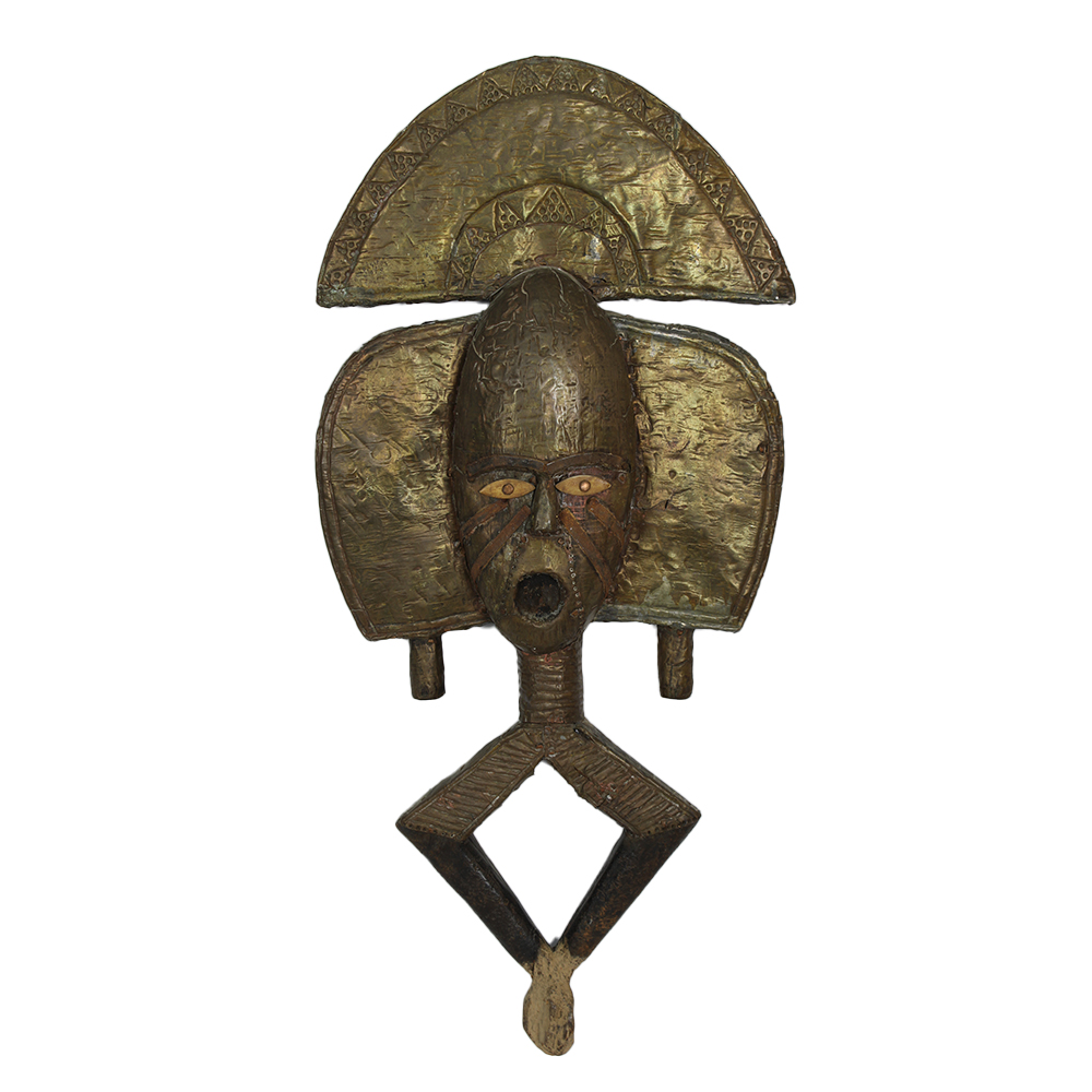 FIGURA NBULU NGULU PER IL RITO BWETE etnia Kota Obamba in legno patina scura ottone rame e ferro. Queste figure venivano messe a capo di ceste in vimini dentro le quali c'erano ossa di defunti ripulite e dipinte. Era vietata la partecipazione delle donne e stranieri durante i riti che riguardavano queste figure ed erano previste pene severe per gli oltraggi. Gabon h cm 60 x 30 x 2