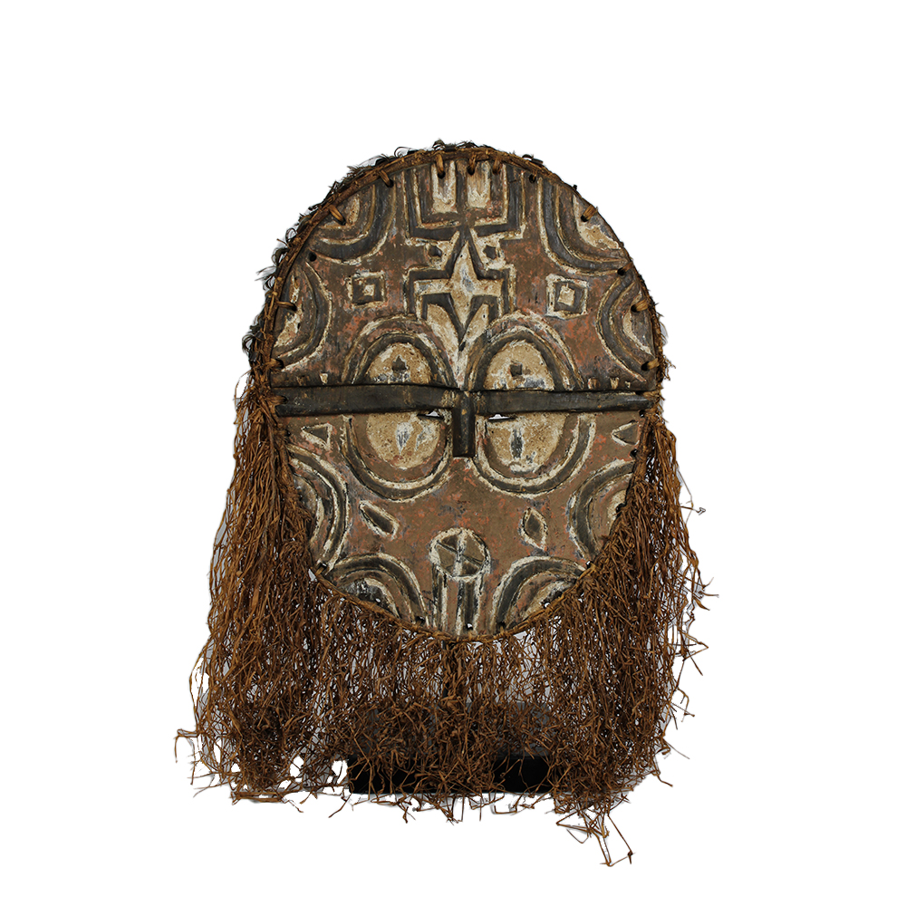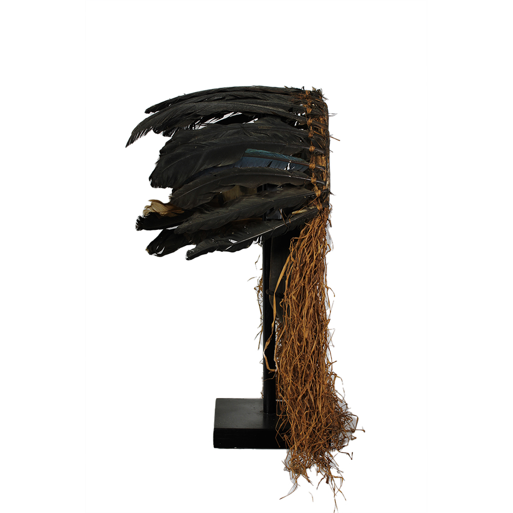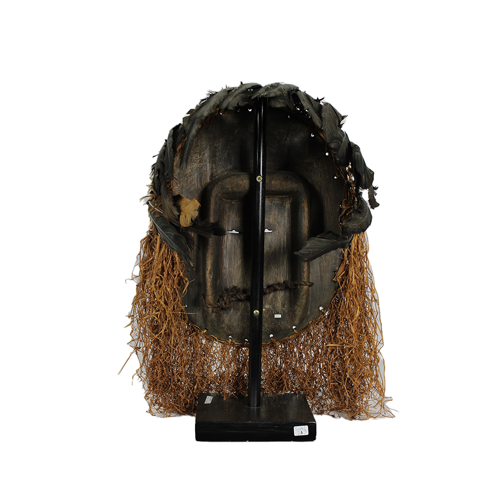 MASCHERA KIDUMU etnia Bateke Tsaayii in legno policromo penne di uccello e rafia, la maschera serviva per consolidare la struttura sociale. Repubblica democratica del Congo h cm 49 x 34 x 27