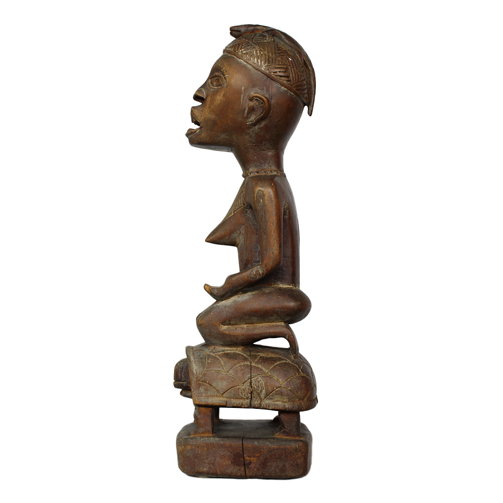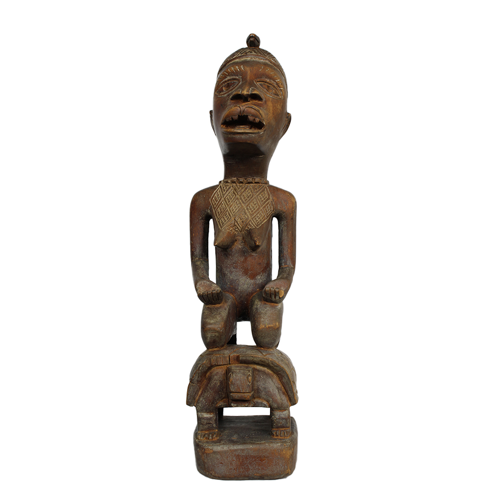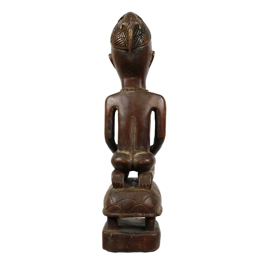 FIGURA D'ANTENATA NIONGI etnia Bayombe' in legno a patina scura lucida, figura che si poneva a protezione di una sepoltura di un notabile , inginocchiata su una testuggine associata alla longevità e resistenza alla magia nera. Congo h cm 35 x 11 x 9