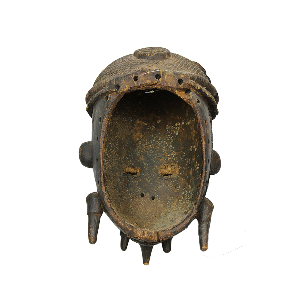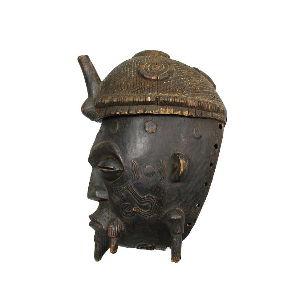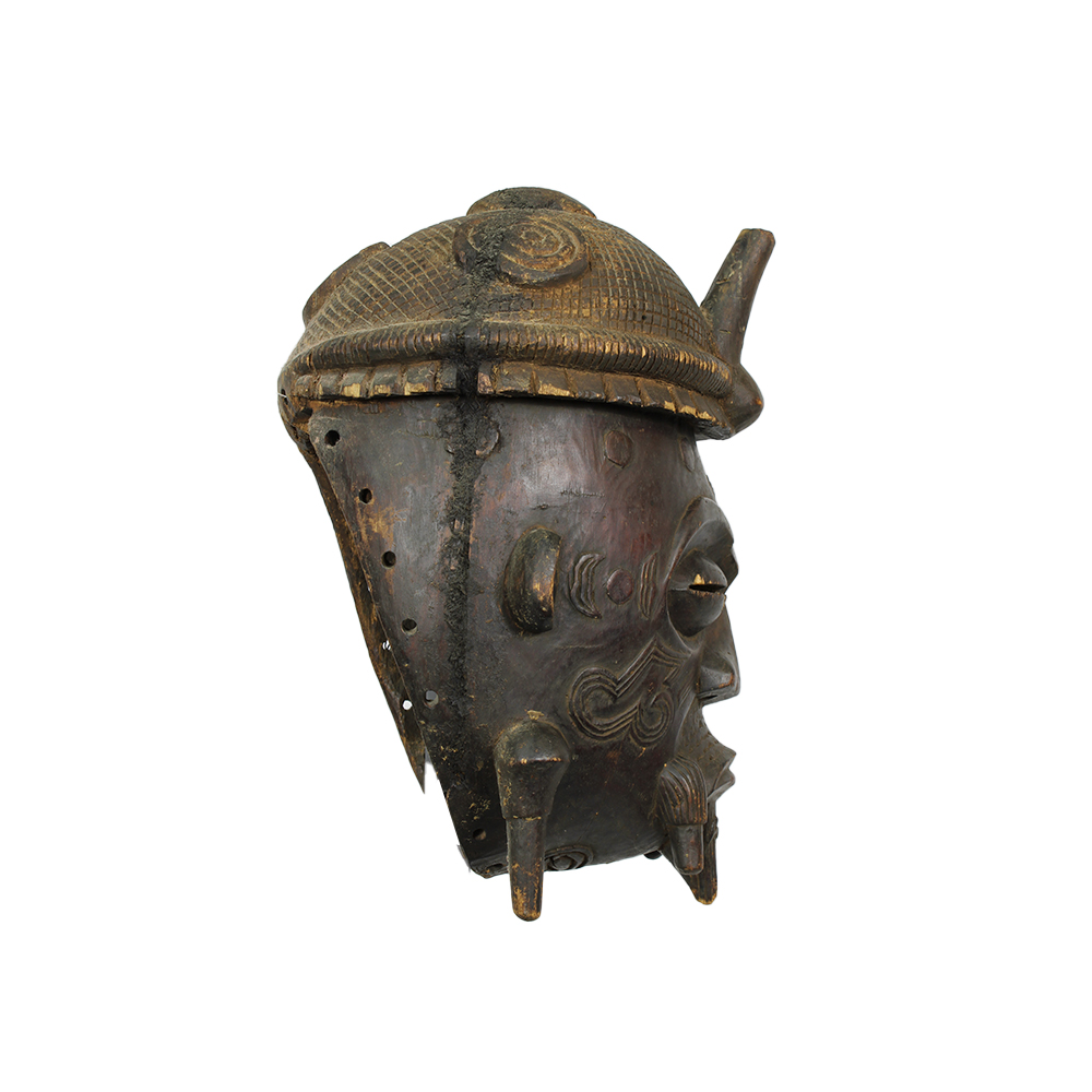 MASCHERA A CASCO MUKISHI etnia Benalulua in legno a patina scura, maschera del re esorcista al quale viene affidato l'arduo compito di sconfiggere ed individuare le forze del male, il re se falliva nel suo compito rischiava di essere ucciso dai suoi sudditi. Repubblica democratica del Congo h cm 41 x 25 x 27