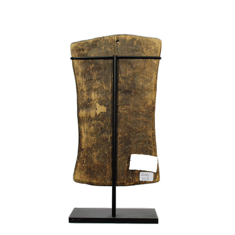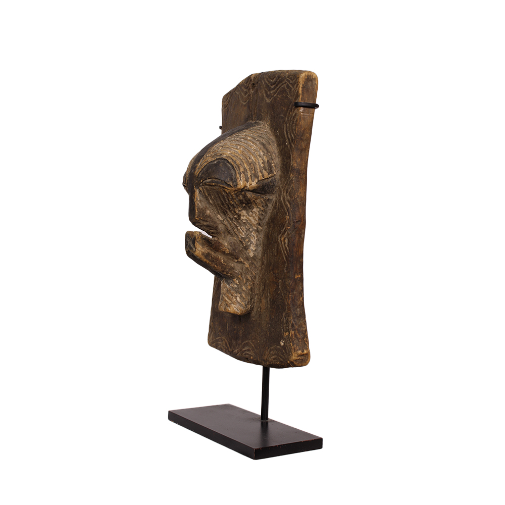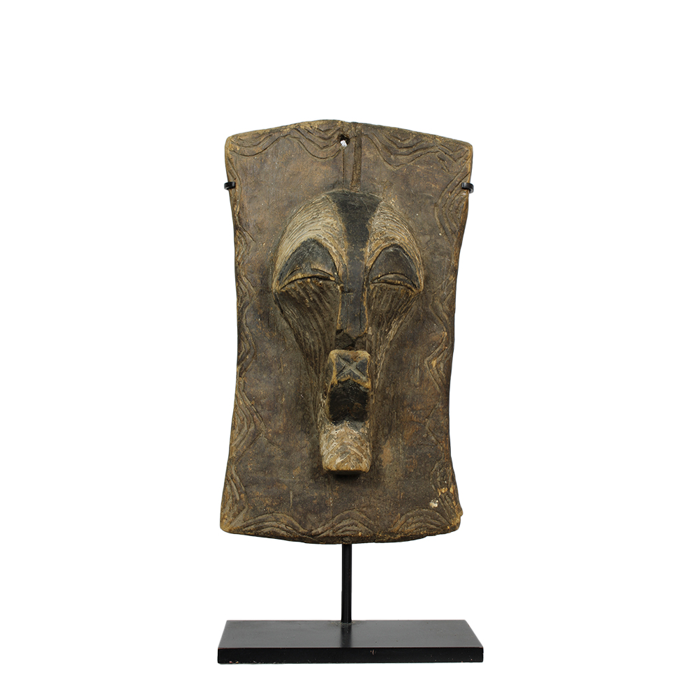 MASCHERA A TAVOLETTA DEL TIPO FEMMINILE KIFWEBE SONGYE (raccolto in sito dal medico missionario Dr. Dandoy nel 1940), in legno a patina scura, maschera che raffigura viso femminile ha una duplice funzione, quella della danza rituale e quella di emblema di una società, da appendere su un recinto. Repubblica democratica del Congo h cm 23 x 14 x 8